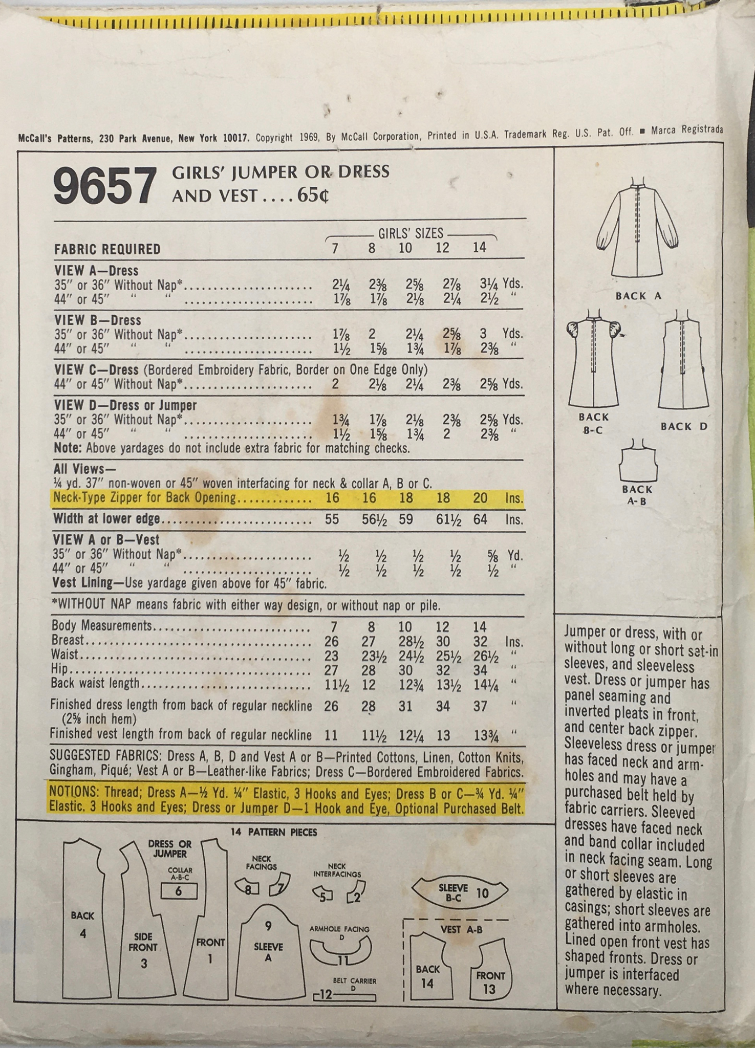 Girl’s Jumper or Dress: Jumper or dress, with or without long or short set-in sleeves, and sleeveless vest. Dress or jumper has panel seaming and inverted pleats in front, and centre back zipper. Sleeveless dress or jumper has faced neck and armholes and may have a purchased belt held by fabric carriers. Sleeved dresses have faced neck and band collar included in neck facing seam. Long or short sleeves are gathered by elastic in casings; short sleeves are gathered into armholes. Lined open front vest has shaped fronts. Dress or jumper in interfaced where necessary.