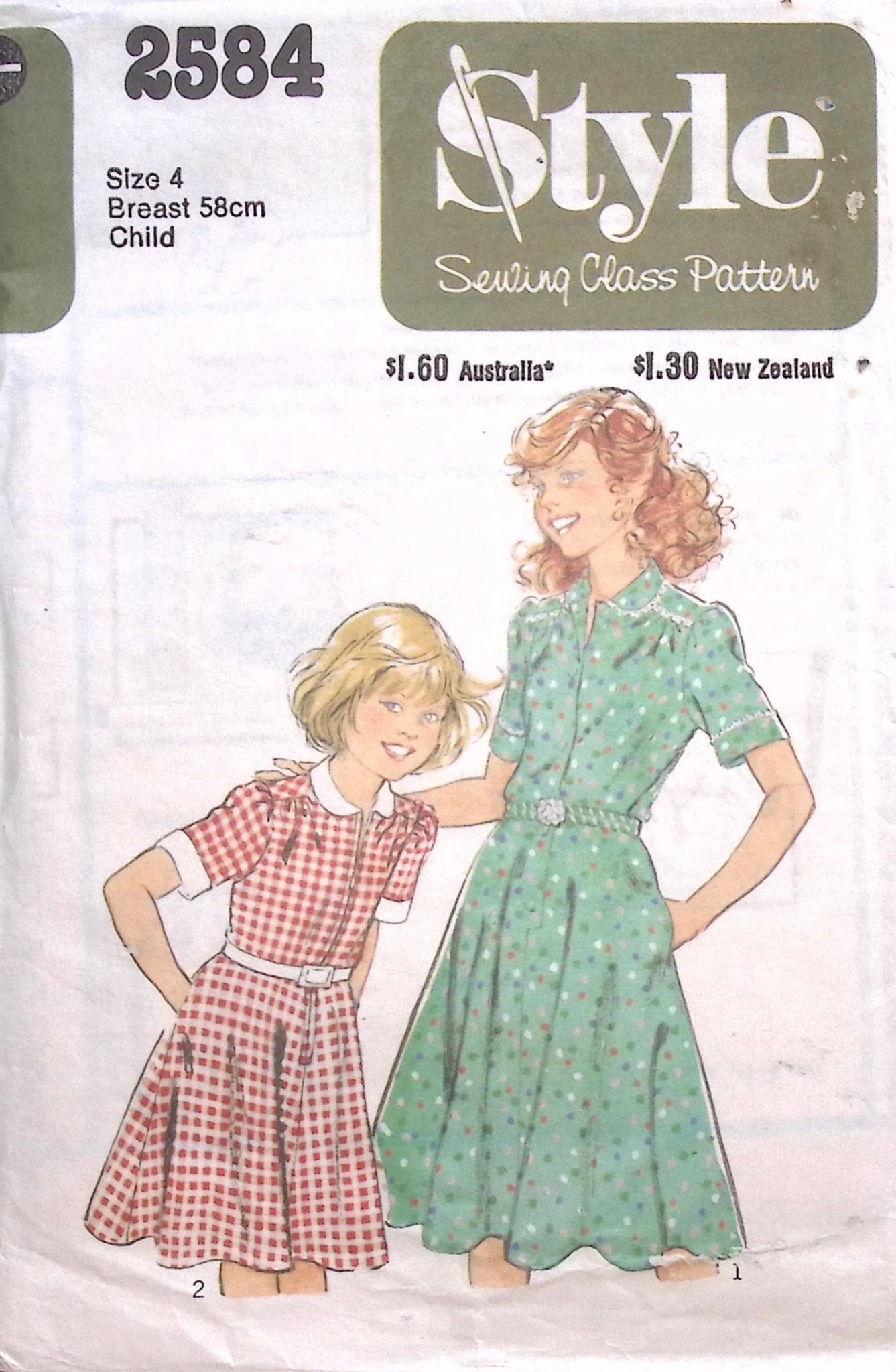 Sewing Class Pattern - Child's and Girls' Dresses: Dresses are softly gathered to forward shoulder seam, and have rounded collar, side seam pockets and flared four-gore skirt attached to bodice at waistline. Short sleeves, gathered at head, are finished with bands. View 1, front buttoned, is completed with trimming. View 2, featuring contrast fabric for collar and sleeve bands, has front zipper fastener. Both views are worn with purchased belt.