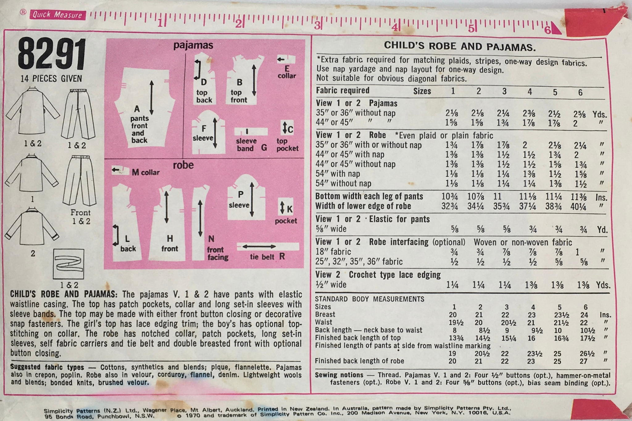 Child’s Robe and Pyjamas: The pyjama View 1 and 2 have pants with elastic waistline casing. The top has patch pockets, collar and long set-in sleeves with sleeve bands. The top may be made with either front button closing or decorative snap fasteners. The girl’s top has lace edging trim; the boy’s has optional top-stitching on collar. The robe has notched collar, patch pockets, long set-in sleeves, self fabric carriers and tie belt and double breasted front with optional button closing.