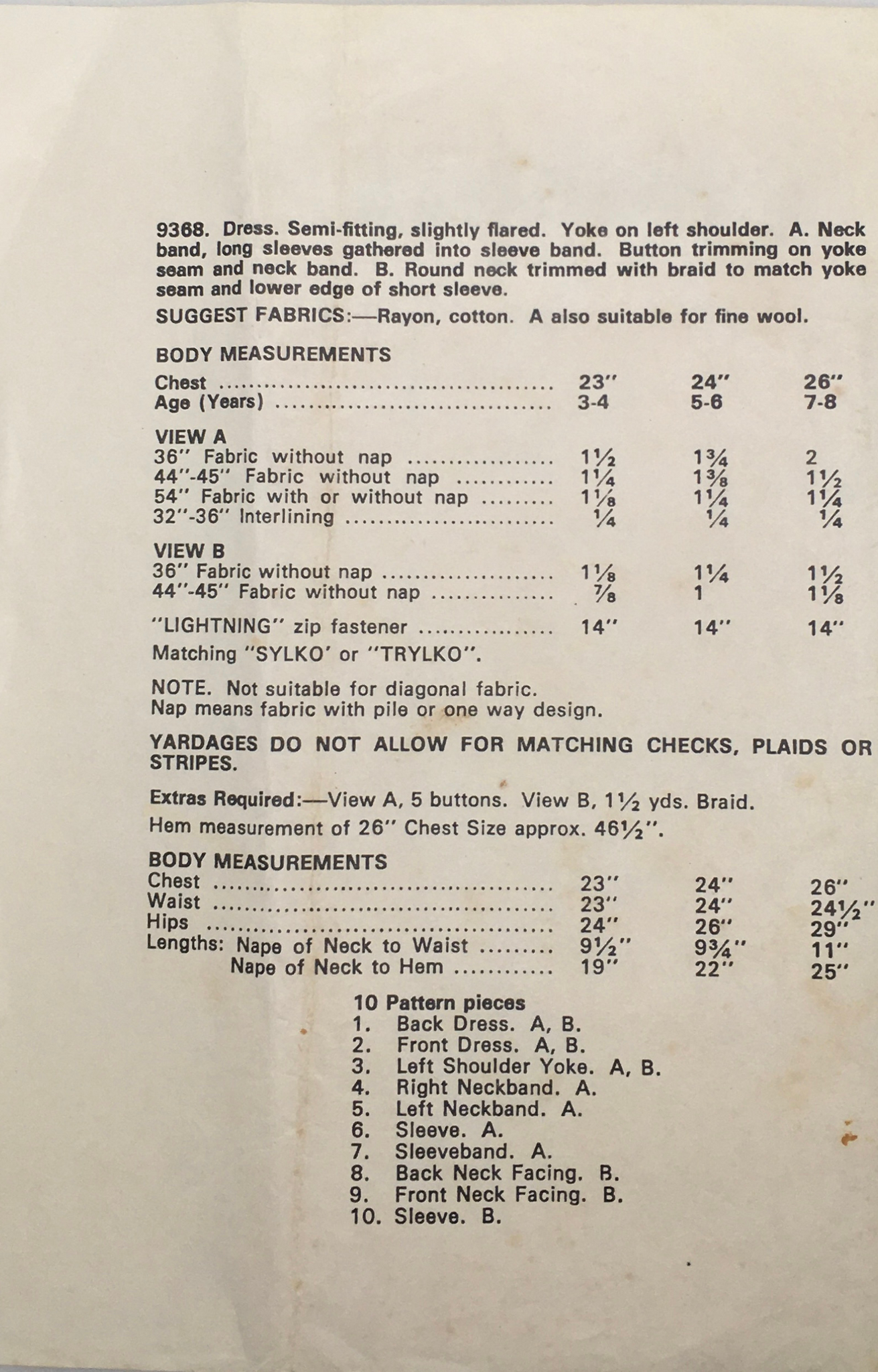 Girl’s Dress: Semi-fitting, slightly flared. Yoke on left shoulder. View A neck band, long sleeves gathered into sleeve band. Button trimming on yoke seam and neck band. View B Round neck trimmed with braid to match yoke seam and lower edge of short sleeve.
