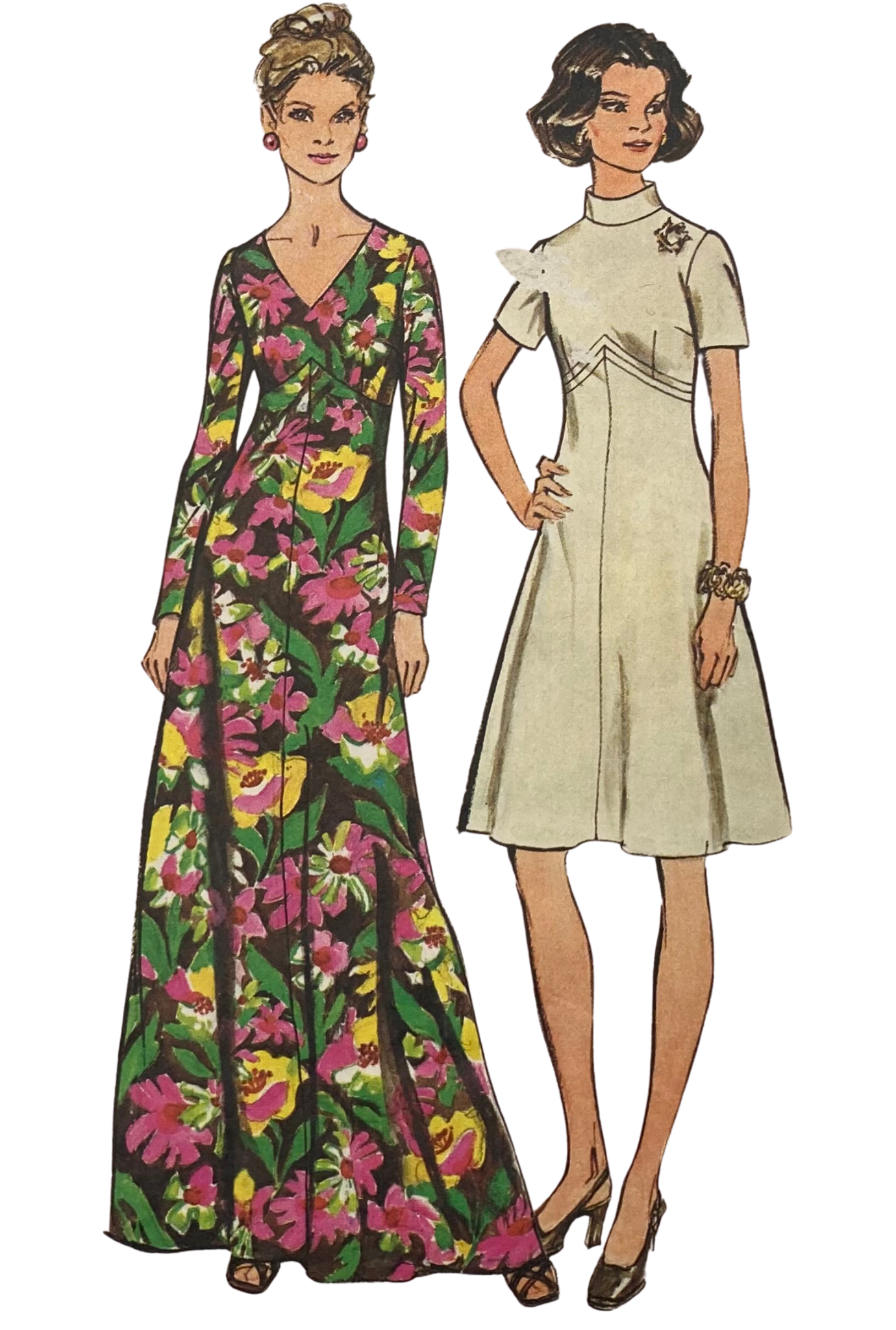 Misses' Dress: Elevate your wardrobe with a dress that exudes elegance and versatility. Whether you choose the shorter or longer length, this sewing pattern empowers you to create a timeless garment with a flattering silhouette. With its flared skirt, shaped bodice, and choice of set-in sleeves, the dress offers endless possibilities for expressing your style and creating a wardrobe staple that suits various occasions. ©1975.
