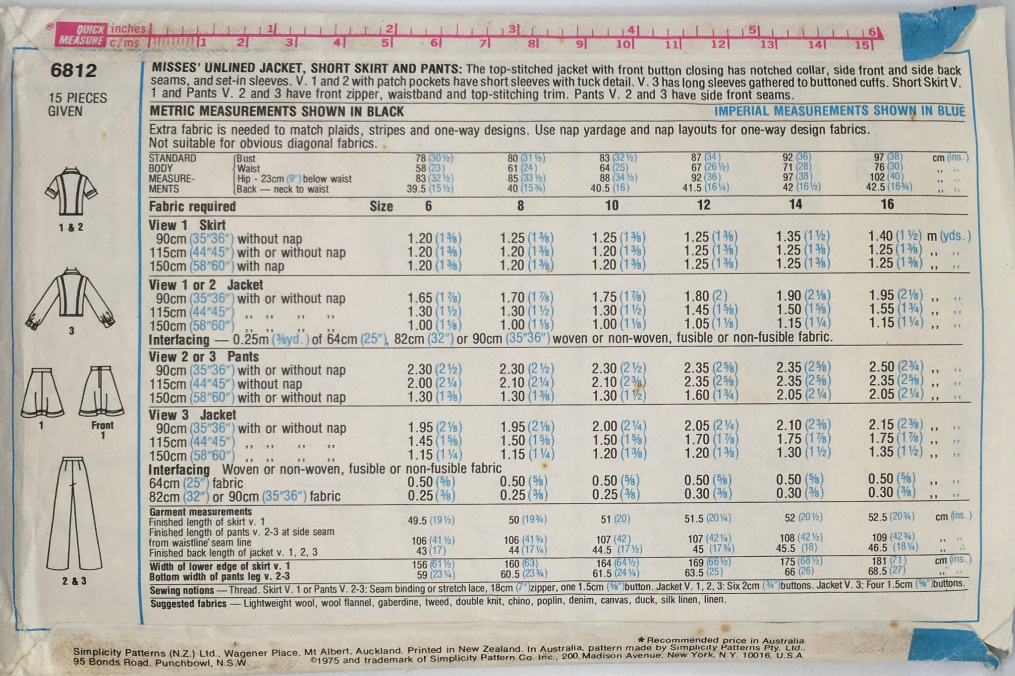 Misses' Unlined Jacket, Short Skirt and Pants: The top-stitched jacket with front button closing has notched collar, side front and side back seams, and set-in sleeves. View 1 & 2 with patch pockets have short sleeves with tuck detail. View 3 has long sleeves gathered to button cuffs. Short Skirt View 1 and Pants View 2 & 3 have front zipper, waistband and top-stitching trim. Pants View 2 & 3 have side front seams.