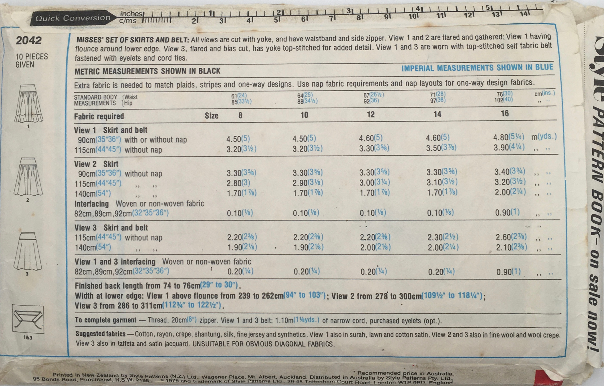 Misses’ Set of Skirts and Belt: All views are cut with yoke, and have waistband and side zipper. View 1 and 2 are flared and gathered. View 1 having flounce around lower edge. View 3 flared and bias cut, has yoke top-stitched for added detail. View 1 and 3 are worn with top-stitched self fabric belt fastened with eyelets and cord ties.