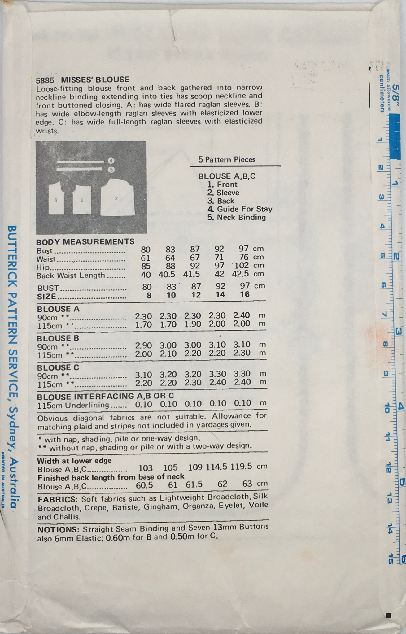 Misses’ Blouse: Loose-fitting blouse front and back gathered into narrow neckline binding extending into ties has scoop neckline and front buttoned closing. View A: Wide flared raglan sleeves. View B: Wide elbow length, raglan sleeves with elasticized lower edge. View C: Wide full-length raglan sleeves with elasticised wrists.