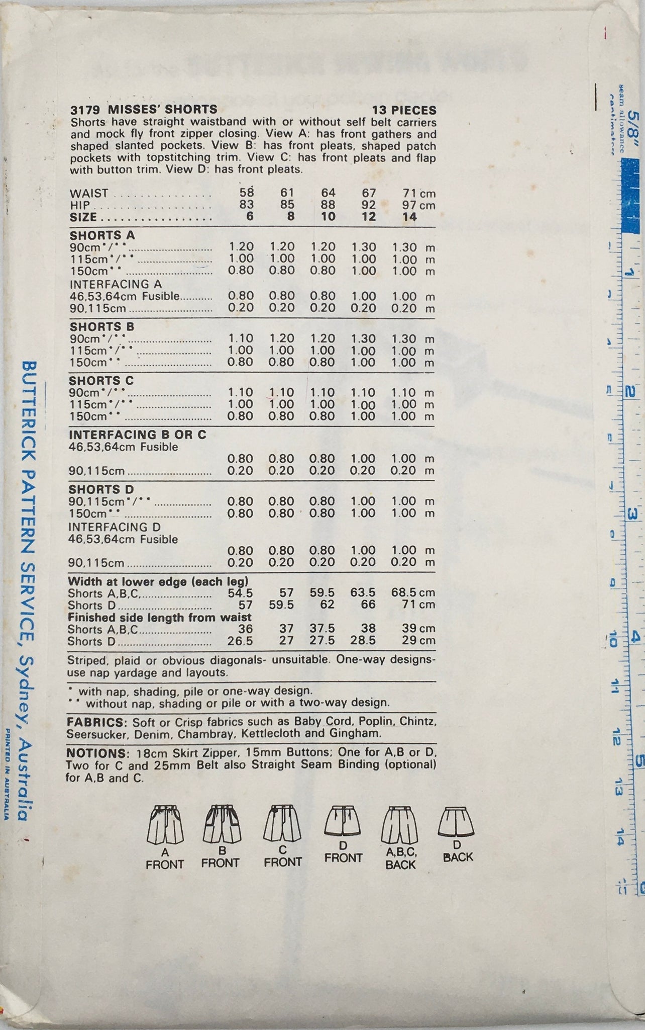 Misses' Shorts: Shorts have straight waistband with or without self belt carriers and mock fly front zipper closing. View A has front gathers and shaped slanted pockets. View B has front pleats, shaped patch pockets with topstitching trim. View C has front pleats and flap with button trim. View D has front pleats.