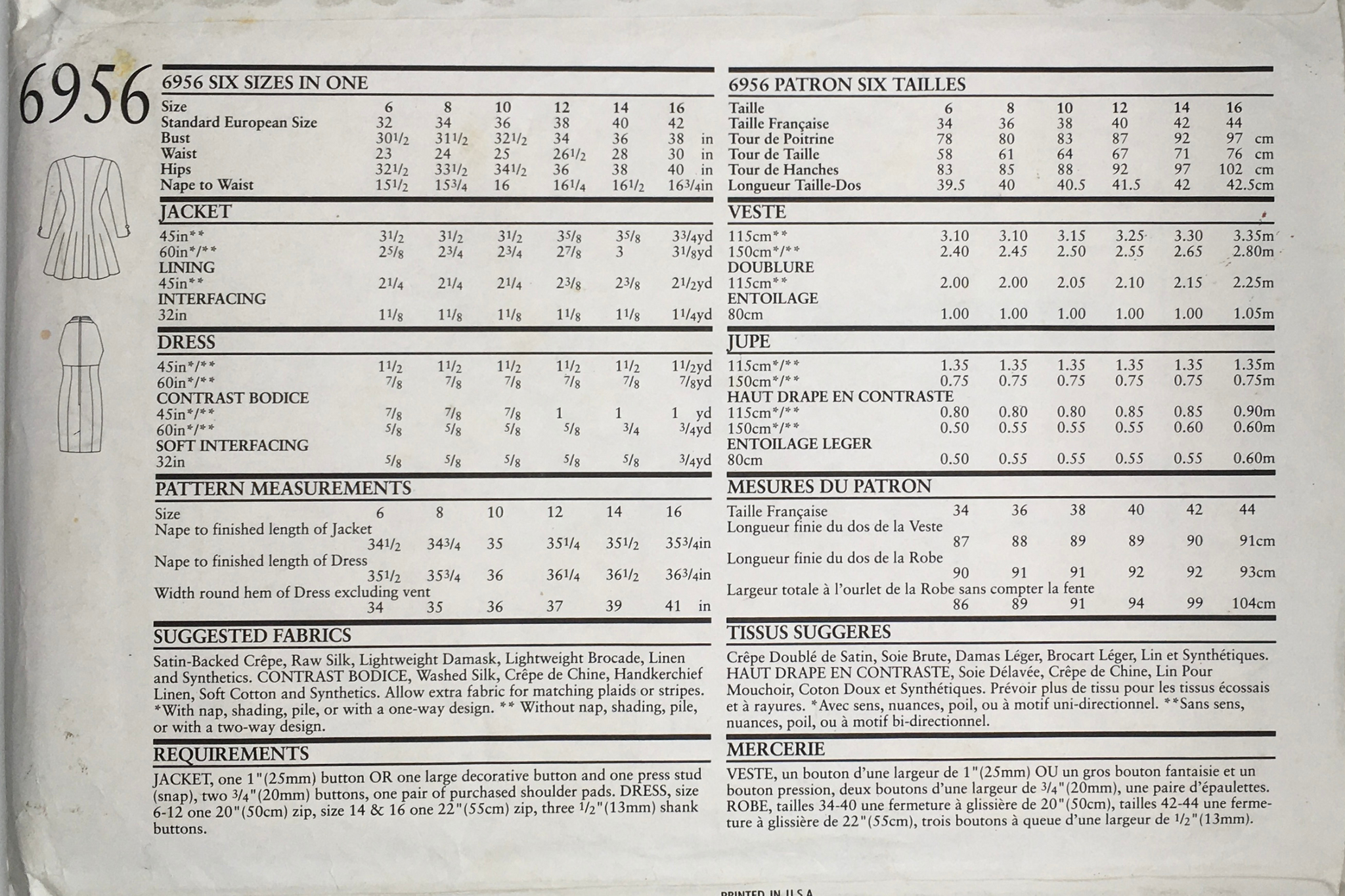 Misses' Dress & Jacket: This fitted women's evening dress exudes elegance and sophistication. The dress features a flattering cross-over V neckline, with the fabric gathered under the bust line to accentuate the waist and create a feminine silhouette. The fitted skirt gracefully follows the contours of the body, adding a touch of allure. Alongside the dress, the pattern includes an exquisite evening jacket with long set-in sleeves, providing coverage and a polished look. The jacket is semi-fitted and closes with a single button or hook at the upper waist, allowing the dress to peek through while offering a touch of coverage. The jacket gracefully flares from under the bust line, adding a subtle and glamorous flair to the overall ensemble. This sewing pattern is the perfect choice for an enchanting evening event or special occasion, promising a stunning and timeless ensemble for the discerning woman. ©1990's
