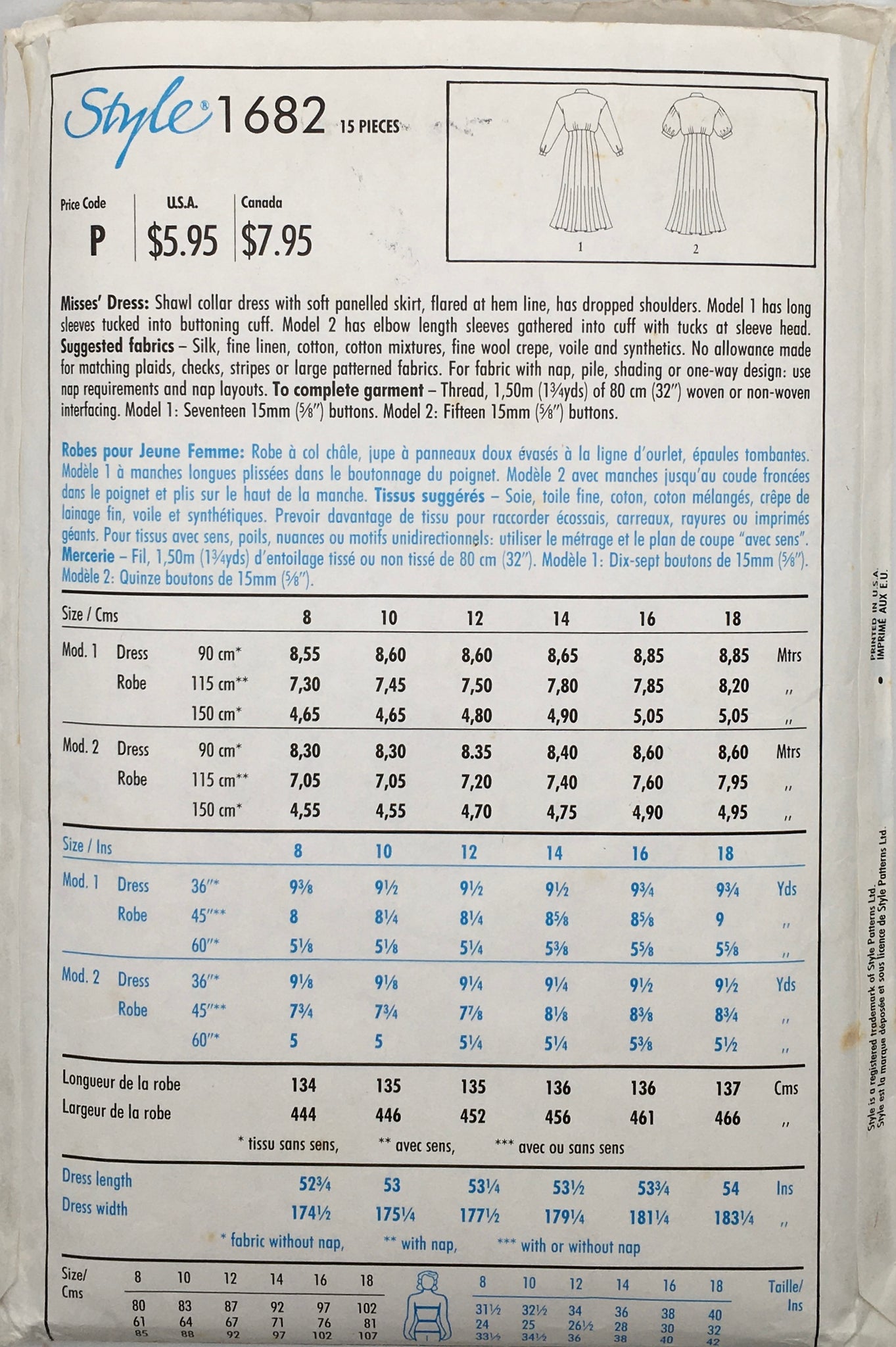 Misses’ Dress: Shawl collar dress with soft panelled skirt, flared at hem line, has dropped shoulders. Model 1 has long sleeves ticked into buttoning cuff. Model 2 has elbow length sleeves gathered into cuff with tucks at sleeve head.