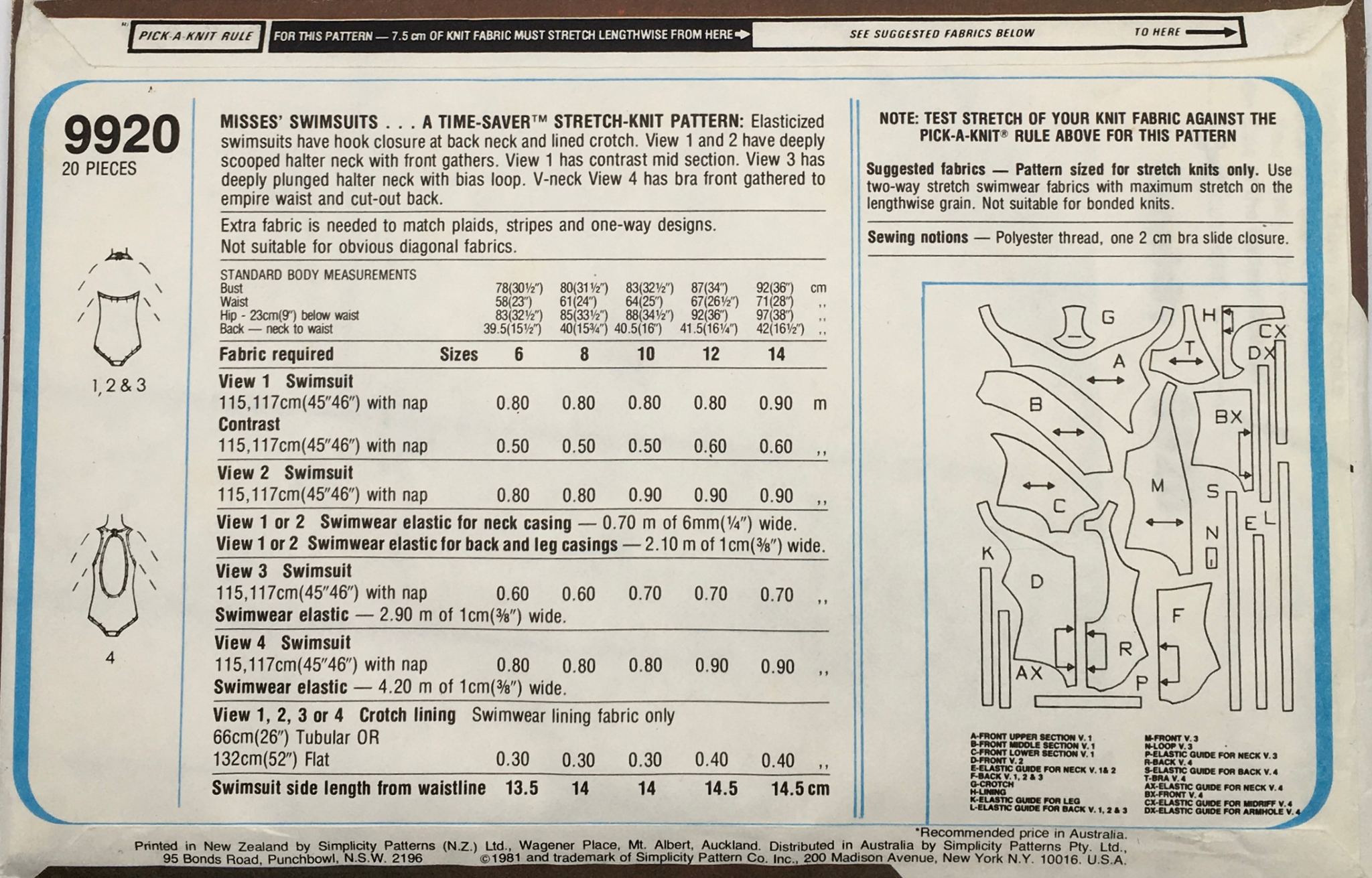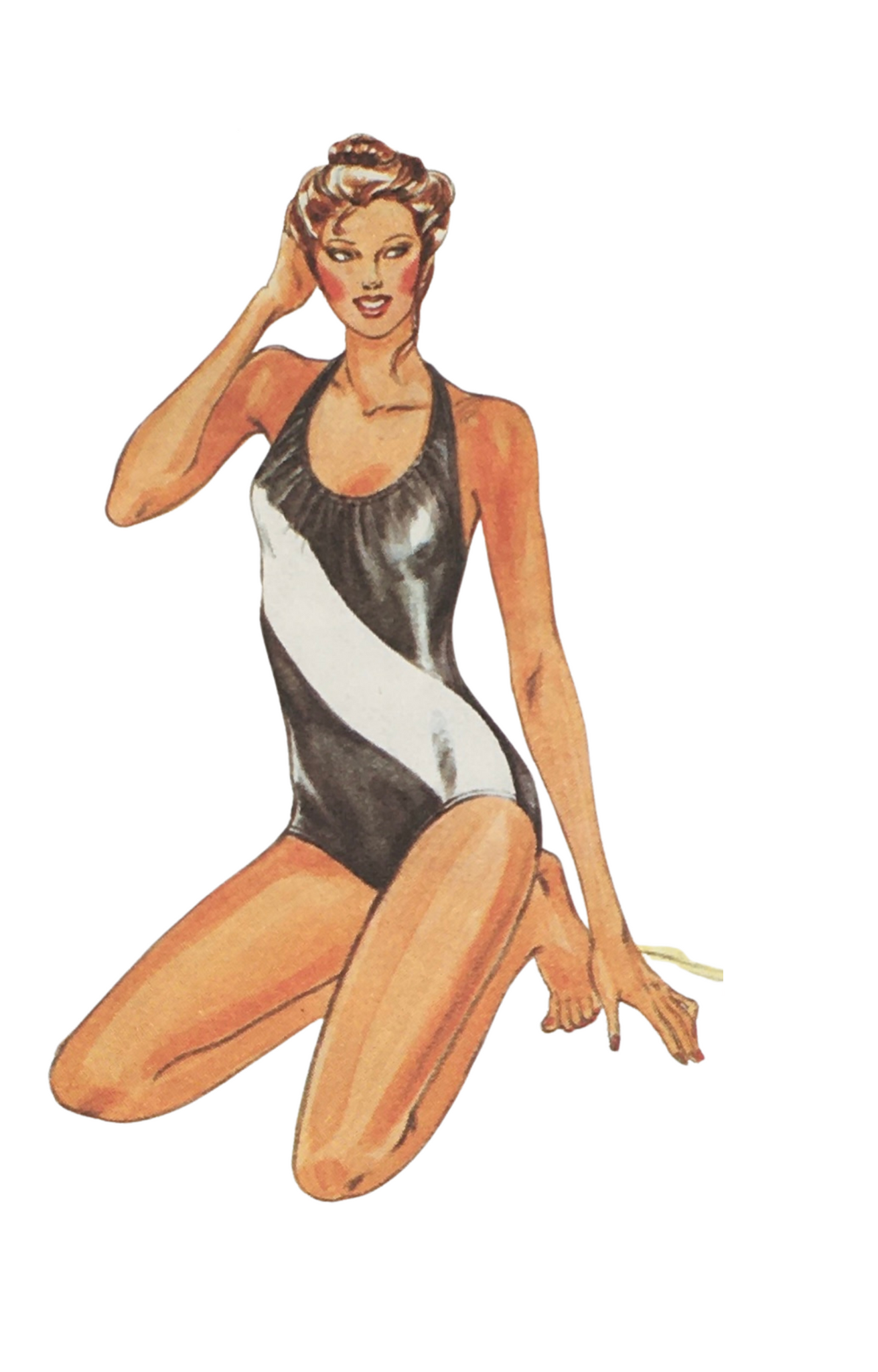 Misses' Swimsuits...A Time-Saver Stretch Knit Pattern: Elasticised swimsuits have hook closure at back neck and lined crotch. View 1 and 2 have deeply scooped halter neck with front gathers. View 1 has contrast mid section. View 3 has deeply plunged halter neck with bias loop. V-neck View 4 has bra front gathered to empire waist and cut-out back.