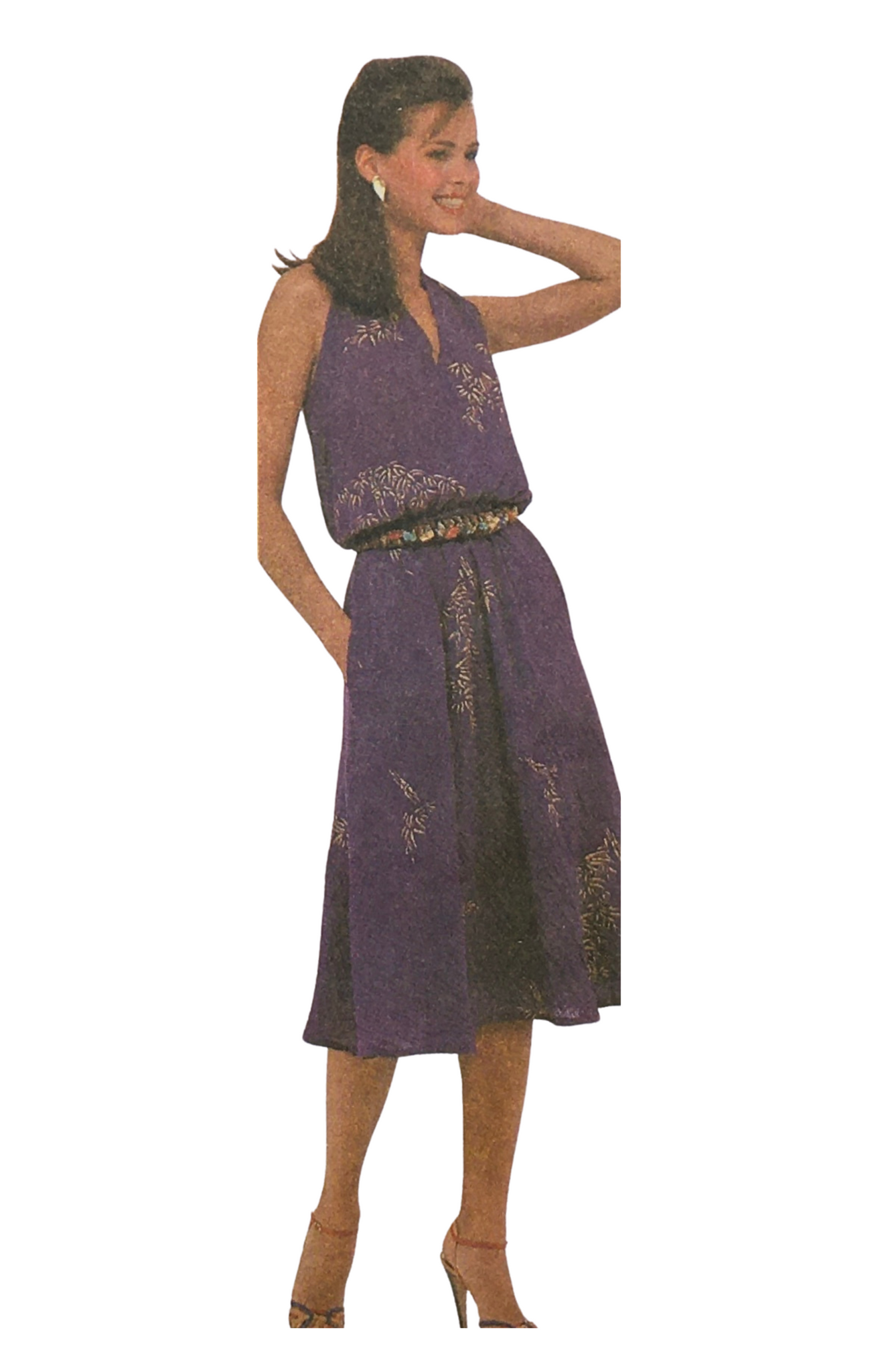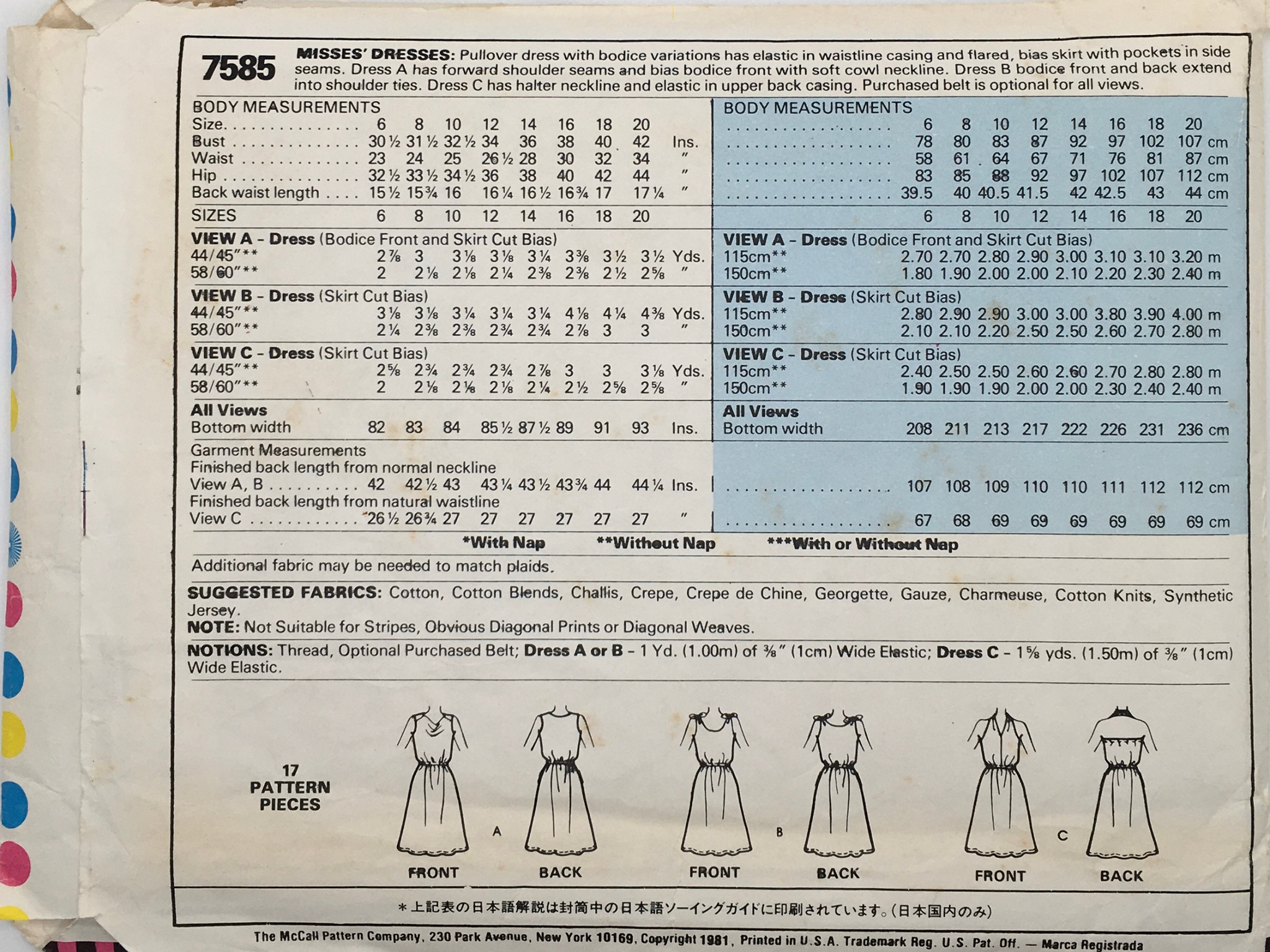 Misses' Dress: Pullover dress with bodice variations has elastic in waistline casing and flared, bias skirt with pockets in side seams. Dress A has forward shoulder seams and bias bodice front with soft cowl neckline. Dress B bodice front and back extend into shoulder ties. Dress C has halter neckline and elastic in upper back casing. Purchased belt is optional for all views.