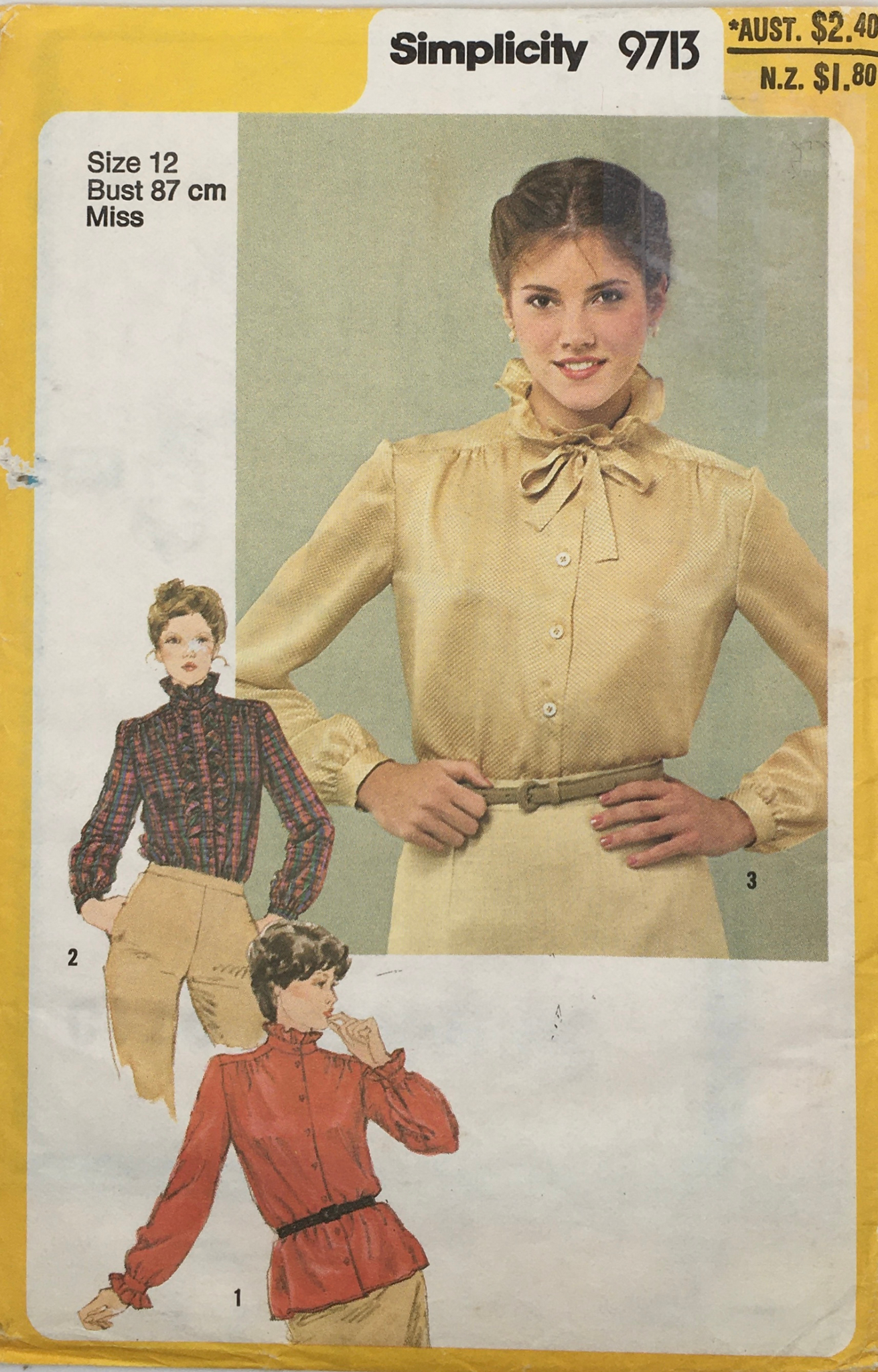 Misses' Blouse with Detachable Jabot: Top-stitched front buttoned blouse gathered to yoke at forward shoulder seams has stand-up collar with neck ruffle and long set-in sleeves gathered to buttoned cuffs. V. 1 has sleeve ruffles. V. 2 has detachable jabot. V. 3 has ties at collar.