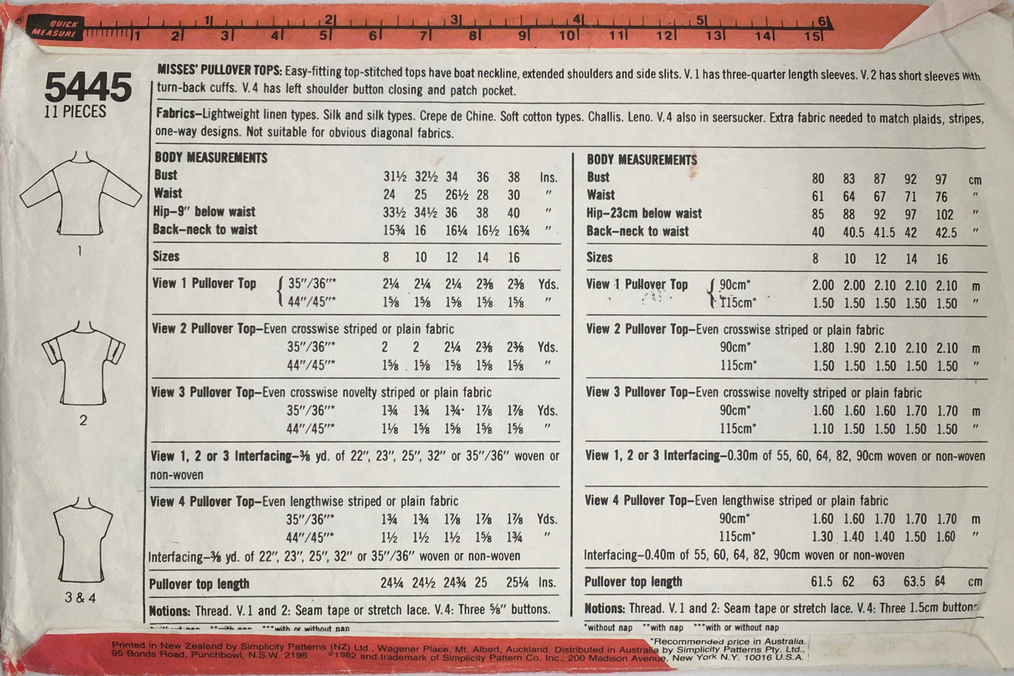 Misses’ Pullover Tops: Easy-fitting top-stitched tops have boat neckline, extended shoulders and side slits. View 1 has three-quarter length sleeves. View 2 has short sleeves with turn-back cuffs. View 4 has left shoulder button closing and patch pockets.