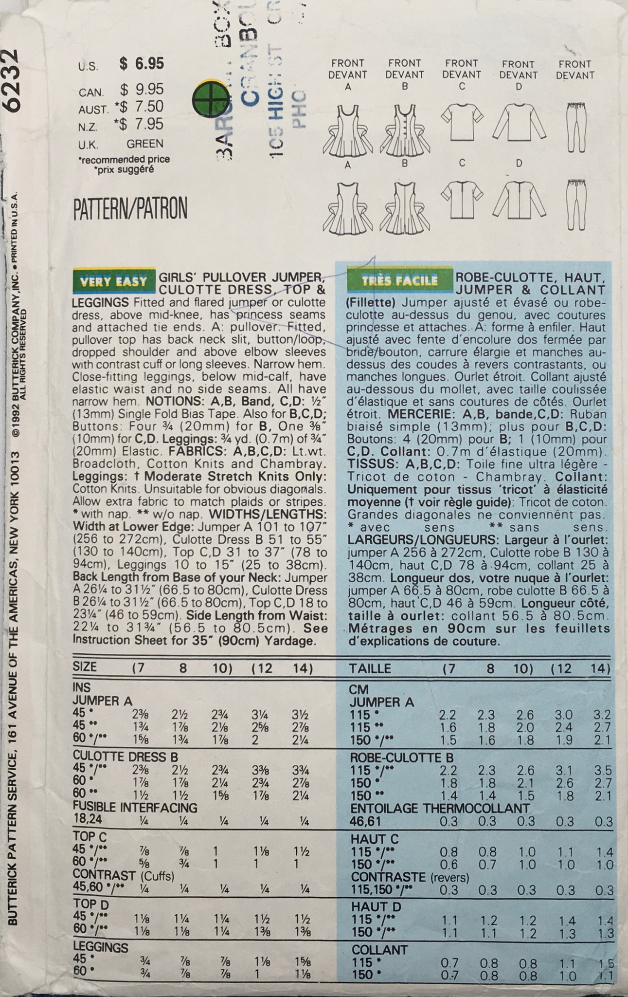 Girls' Pullover Jumper, Culotte Dress, Top and Leggings: Fitted pullover top has back neck slit, button/loop, dropped shoulders and above elbow sleeves with contrast cuffs or long sleeves. Narrow hem, close fitting leggings, below mid calf, have elastic waist and no side seams. All have narrow hem.