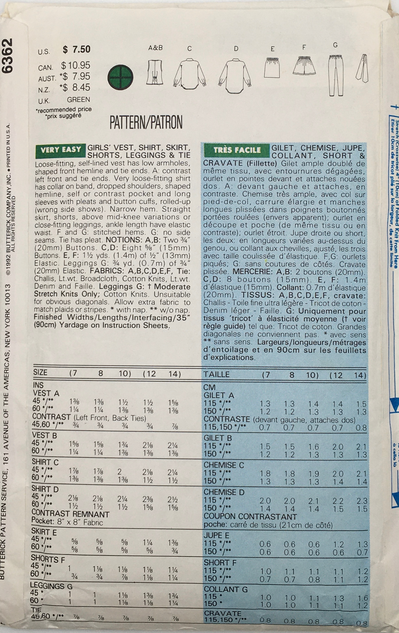 Girls' Vest, Shirt, Skirt, Shorts, Leggings and Tie: Loose-fitting, self-lined vest has low armholes, shaped front and tie ends. Very loose-fitting shirt has collar on band, dropped shoulders, shaped hemline, self or contrast pocket and long sleeves with pleats and button cuffs, rolled-up sleeves. (wrong side shows) Narrow hem, straight skirt, shorts above mid-knee variations or close-fitting leggings, ankle length have elastic waist.