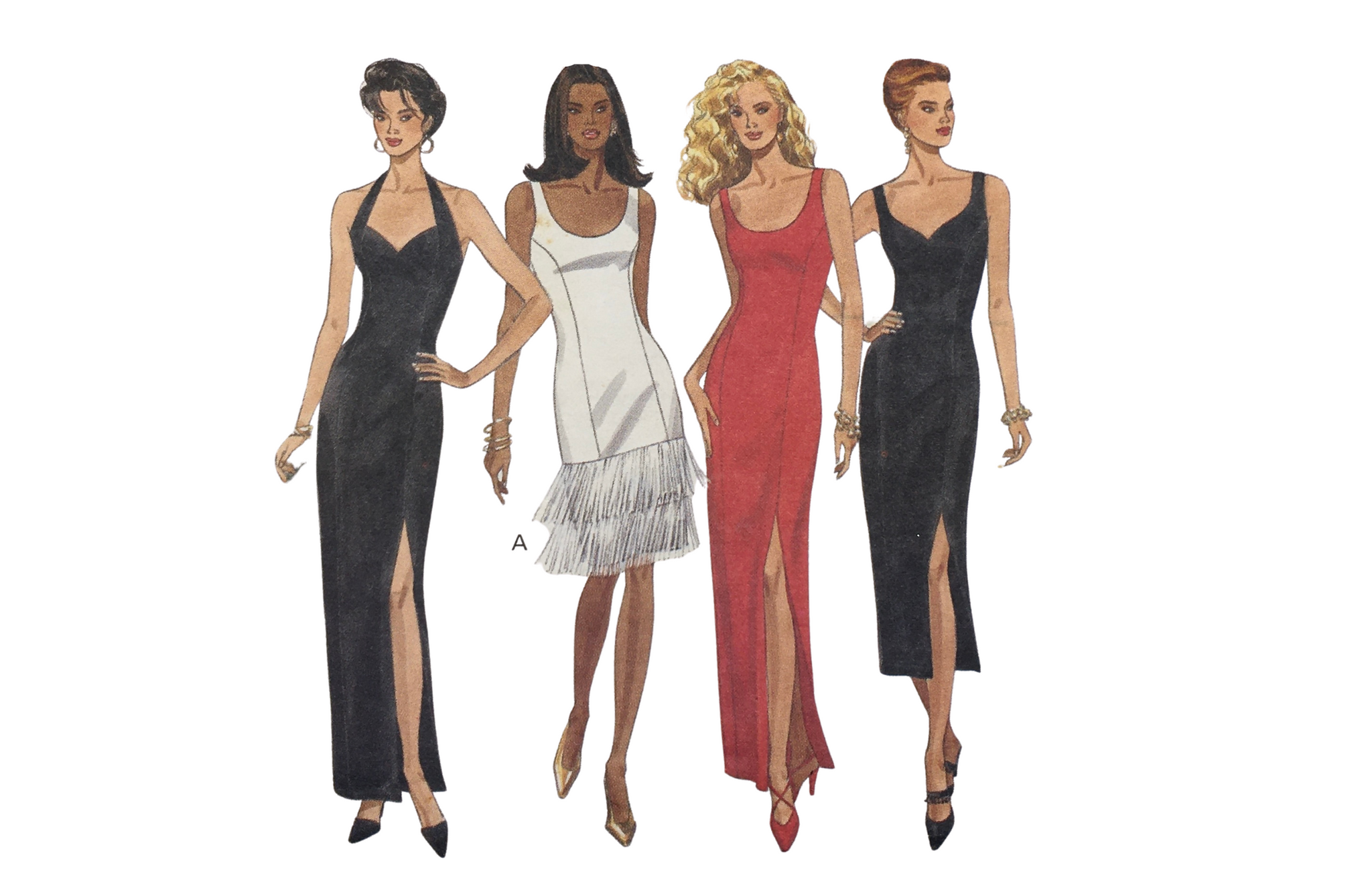 Misses' Dress: Fitted, straight, lined dress, above mid-knee, below mid-calf or evening length, has neckline variations, front princes seems and back zipper. View A; purchased fringe. View E; back princes seems, back button halter neckline. Views B, C, D and E; side front slit.