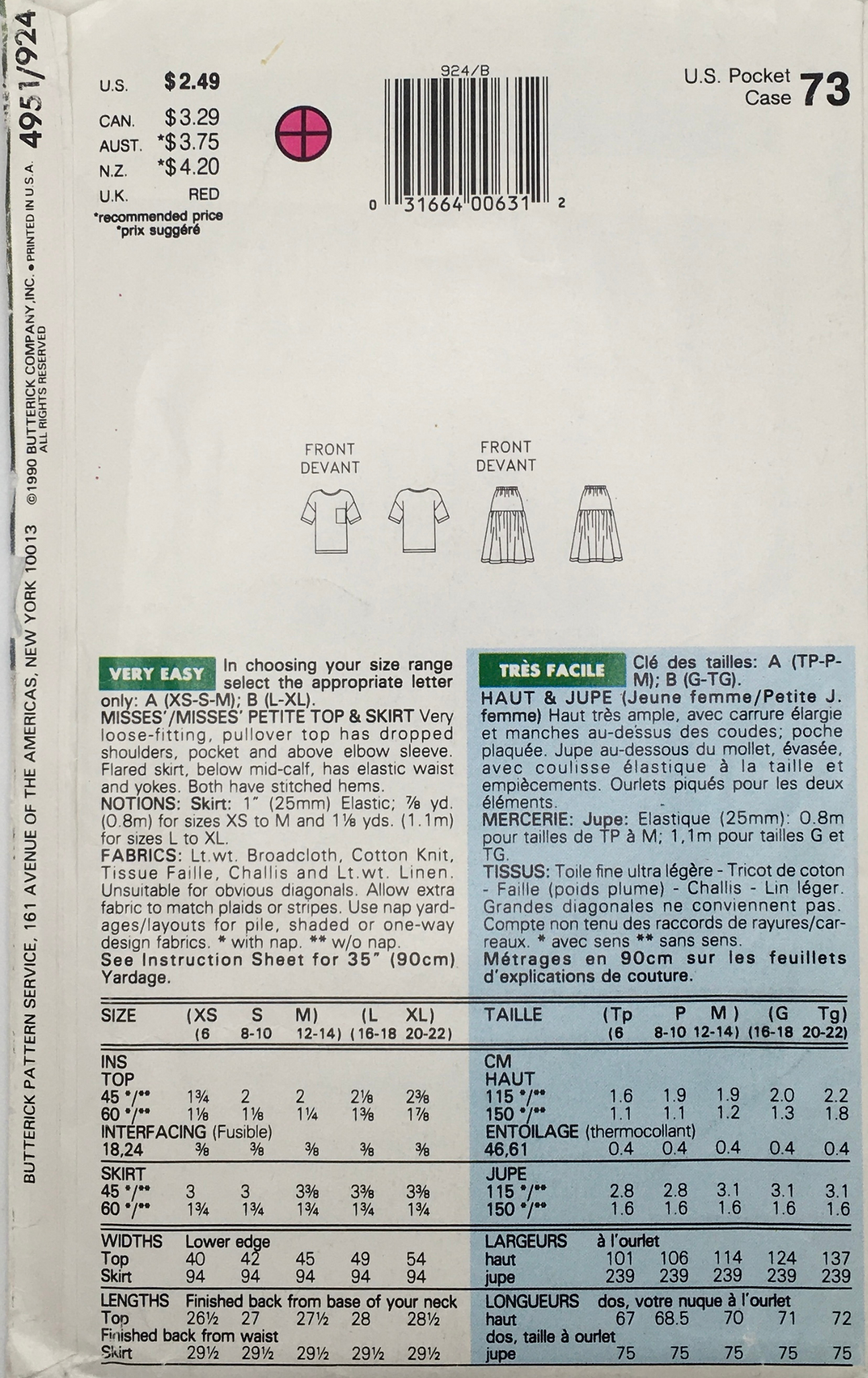 Misses' Top and Skirt: Very loose fitting, pullover top has dropped shoulders, pocket and above elbow sleeves. Flared skirt below mid calf, has elastic waist and yokes. Both have stitched hems.