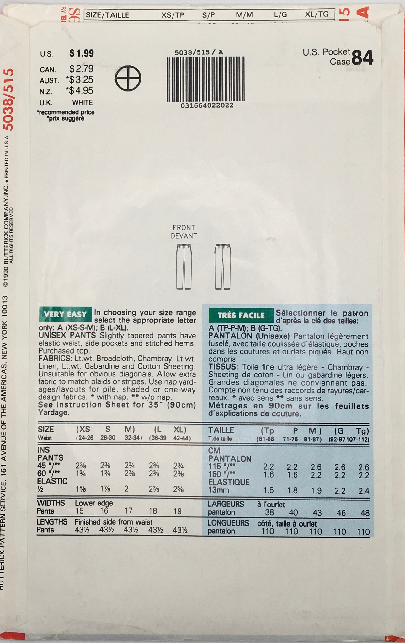 Condition: Pattern is Separated and Cut to Size XS Only. Piece 3 Pants Back small hole near straight grain line and scissor cut down bottom cutting line. Cover in Good Shape.