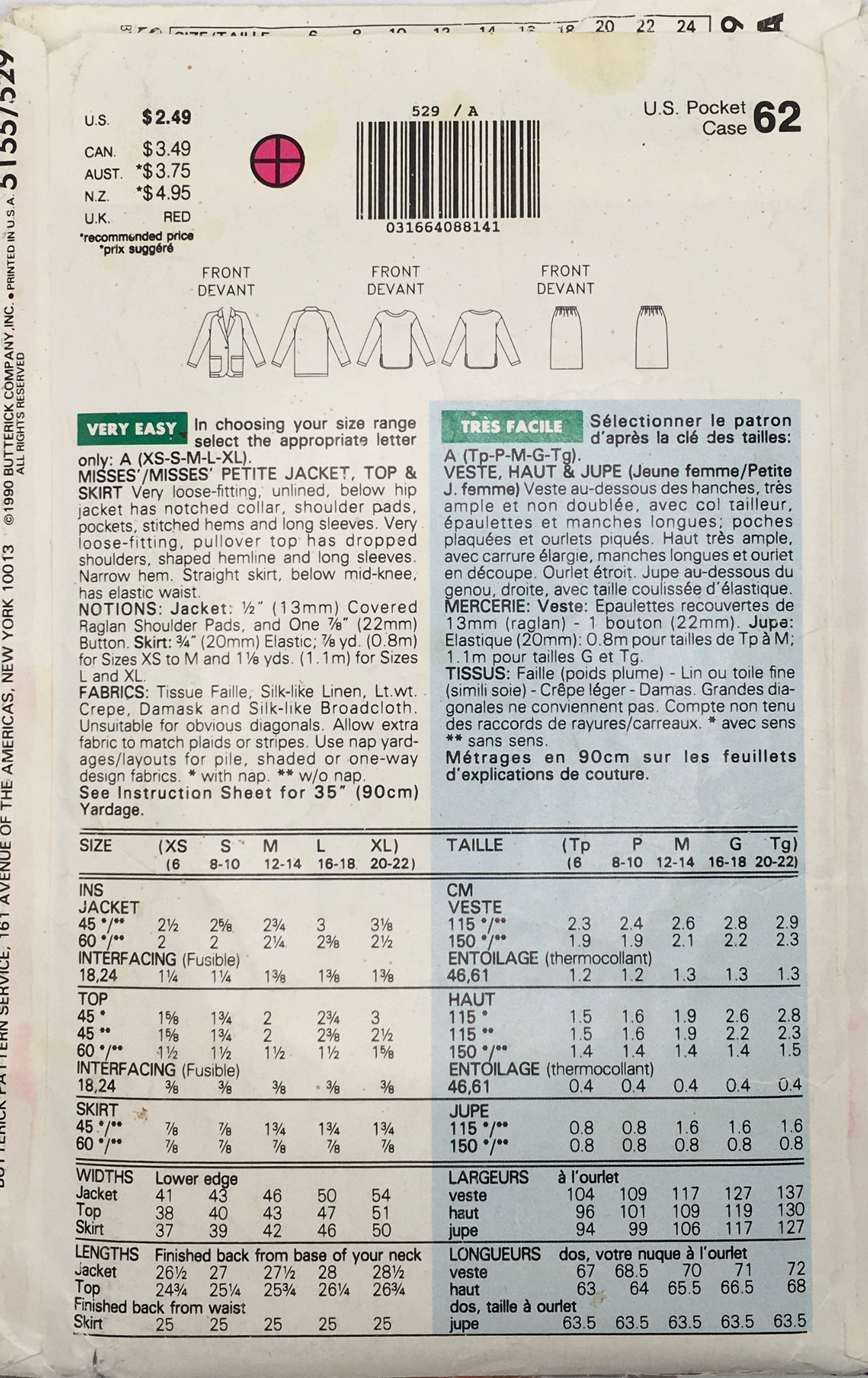 Misses', Miss Petite Jacket, Top and Skirt: Very loose fitting unlined, below hip jacket has notched collar, shoulder pads, pockets, stitched hem and long sleeves. Very loose fitting pullover top has dropped shoulders, shaped hemline and long sleeves. Straight skirt below mid knee has elastic waist.