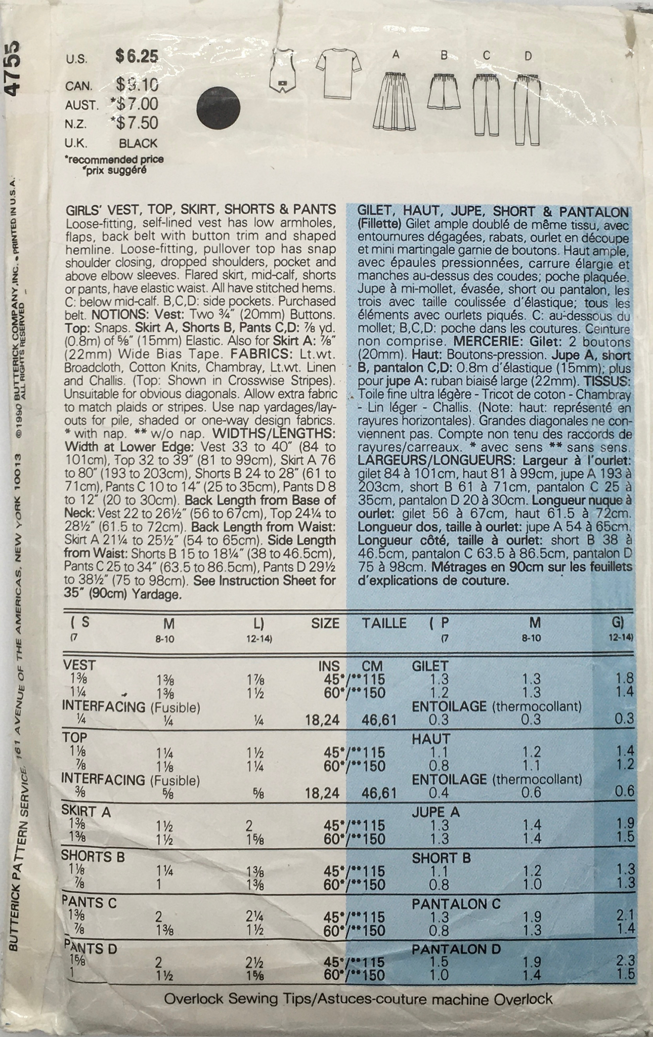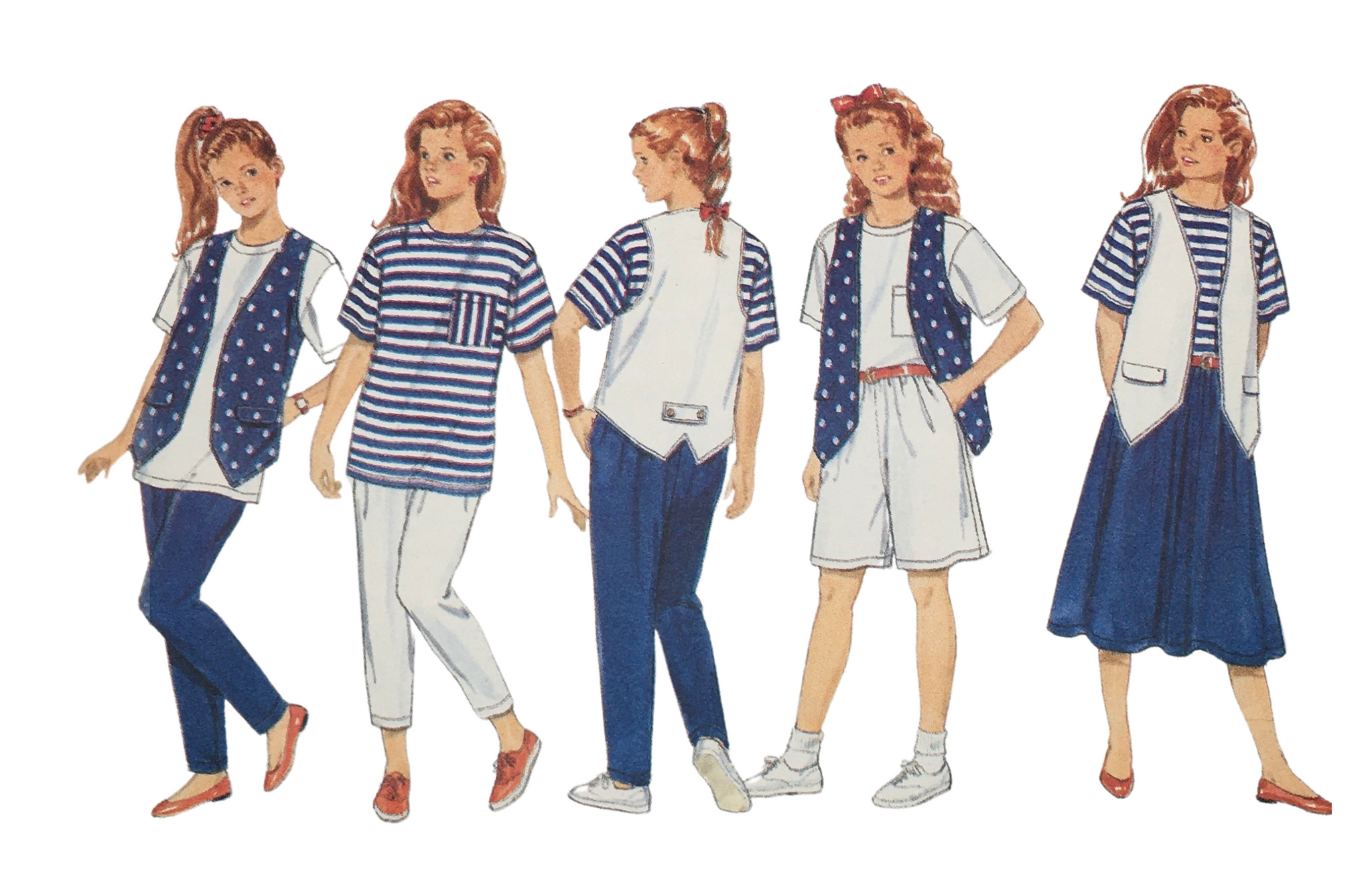 Girl’s Vest, Top, Skirt, Shorts and Pants: Loose-fitting, self lined vest, has low armholes, flaps, back belt with button, trim and shaped hemline. Loose-fitting pull over top, has snap shoulder closing, drop shoulders, pocket and above elbow sleeves. Flared skirt, mid-calf, shorts or pants, have elastic waist. All have stitched hems . View C below mid-calf. View B, C and D side pockets. Purchased belt.