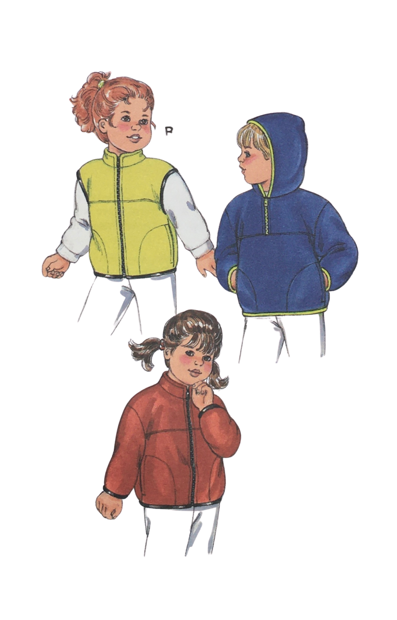 Toddlers’ Jacket and Vest: Toddlers’ jackets and vest have front yoke and forward side seams with pockets. View A jacket has collar, zipper front and bindings from swimwear fabric at bottom edge and sleeves. View B vest has collar, zipper front and bindings from swimwear fabric at bottom edge and armholes. View C pull-over jacket has hood, front yoke with zipper, and bindings from swimwear fabric at bottom edge, sleeves and front edge of hood.