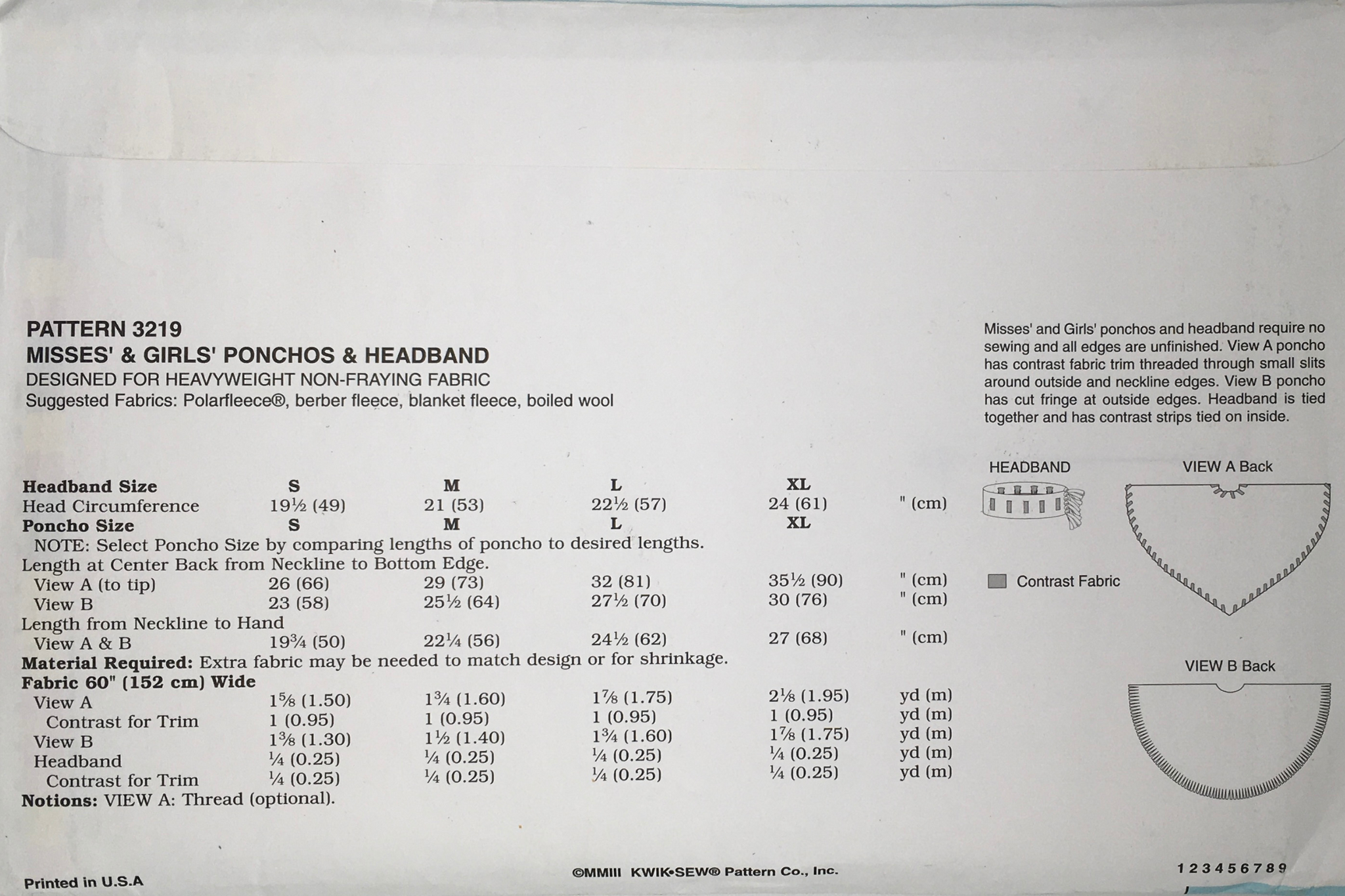 Misses' and Girl's Ponchos and Headbands: Require no sewing and all edges are unfinished. View A poncho has contrast fabric trim threaded through small slits around outside and neckline edges. View B poncho has cut fringe at outside edges. Headband is tied together and has contrast strips tied on inside. finished length at center back.