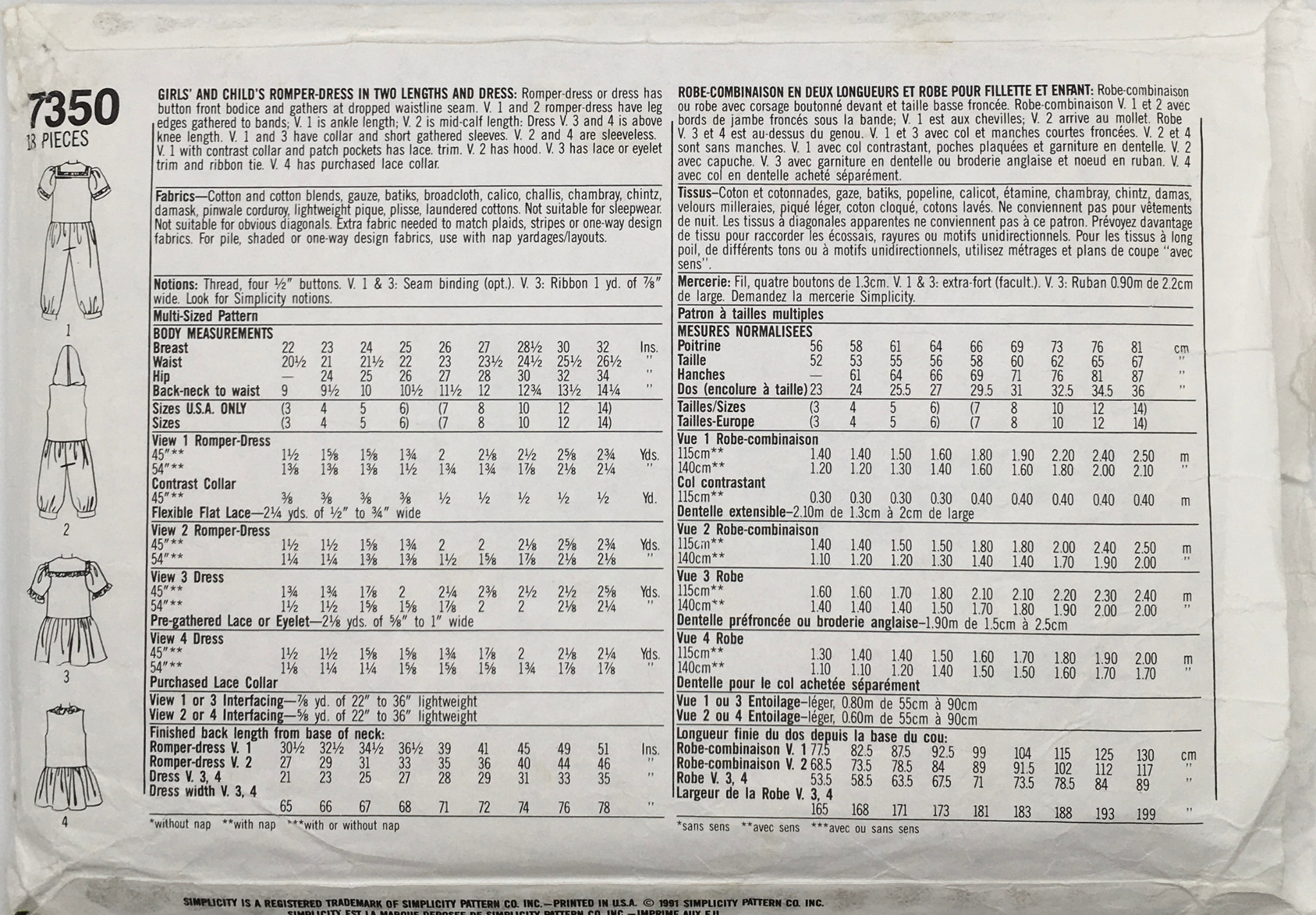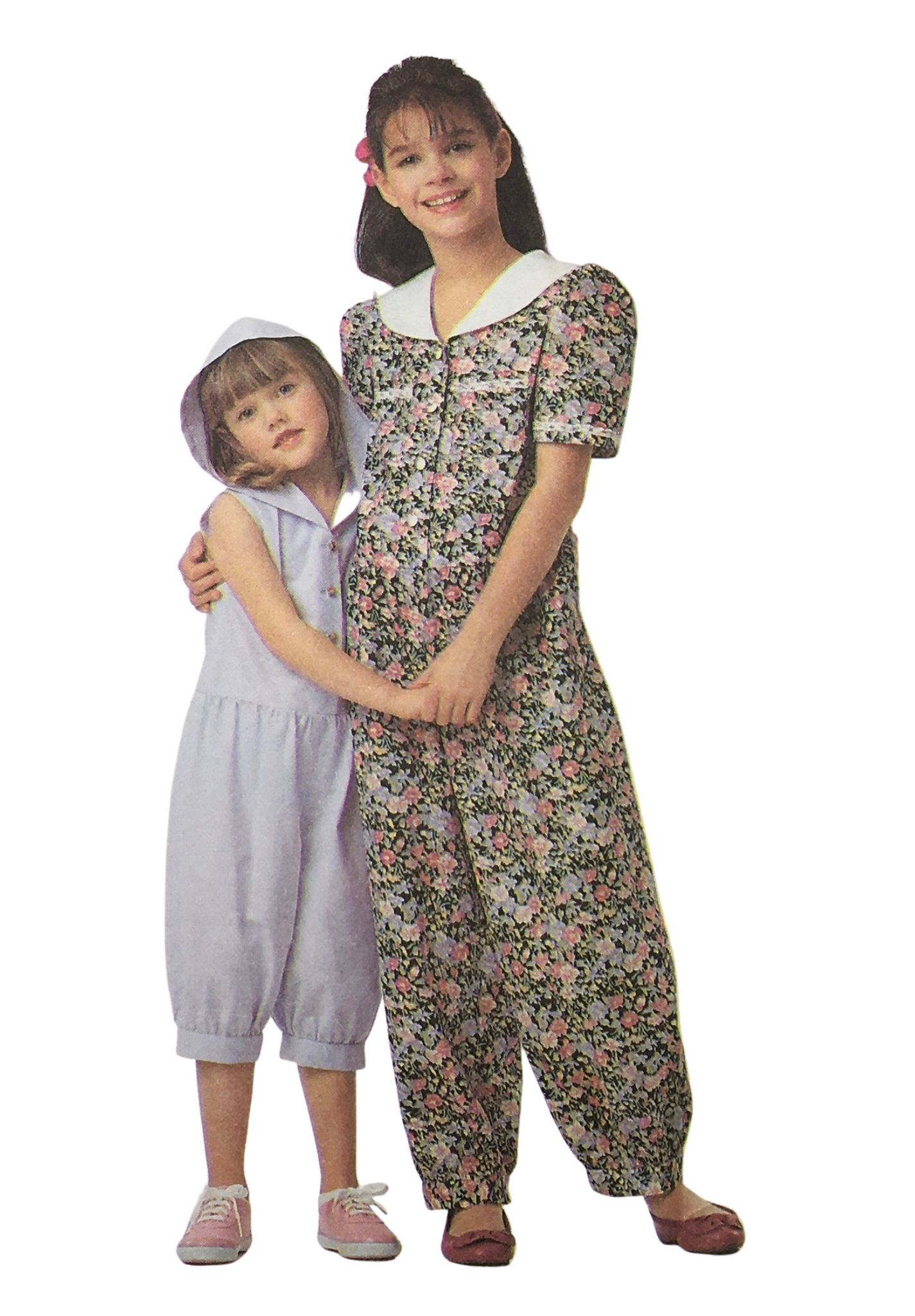 Girl’s and Child’s Romper–Dress in Two Lengths and Dress: Romper dress or dress has button front bodice and gathers at dropped waistline seam. View 1 and 2 romper dress have leg edges gathered to bands. View 1 is ankle-length. View 2 is mid-calf length. Dress View 3 and 4 is above knee-length. View 1 and 3 have collar and short gathered sleeves. View 2 and 4 are sleeveless. View 1 with contrast, collar and patch pockets, has lace trim. View 2 has Hood.View 3 has lace or eyelet trim and ribbon tie. View 4 has purchased lace collar.