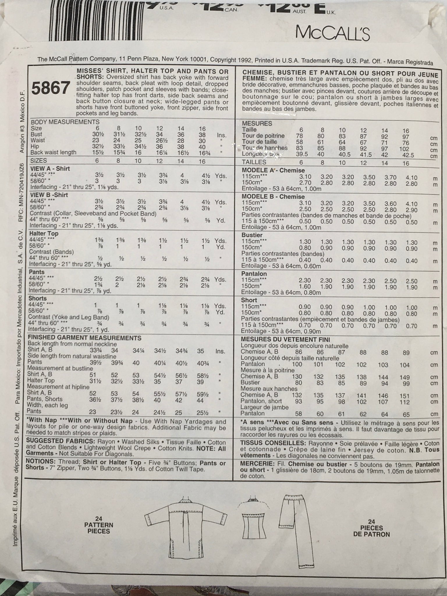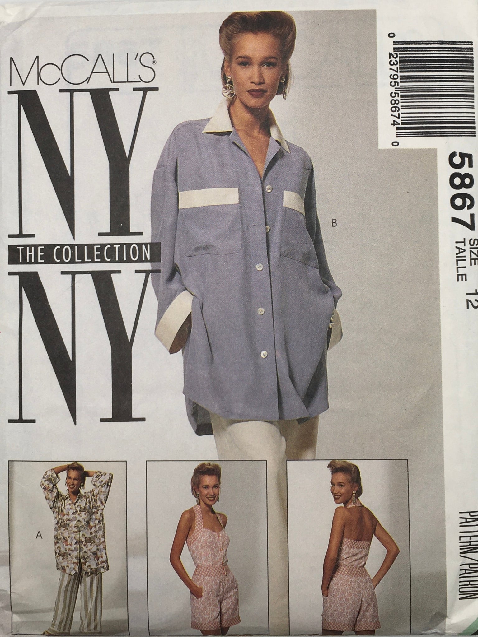 New York Collection: Misses' Shirt, Halter Top And Pants Or Shorts: Oversized shirt has back yoke with forward shoulder seams, back pleat with loop detail, dropped shoulders, patch pocket and sleeves with bands; close-fitting halter top has front darts, side back seams and back button closure at neck; wide-legged pants or shorts have front buttoned yoke, front zipper, side front pockets and leg bands.