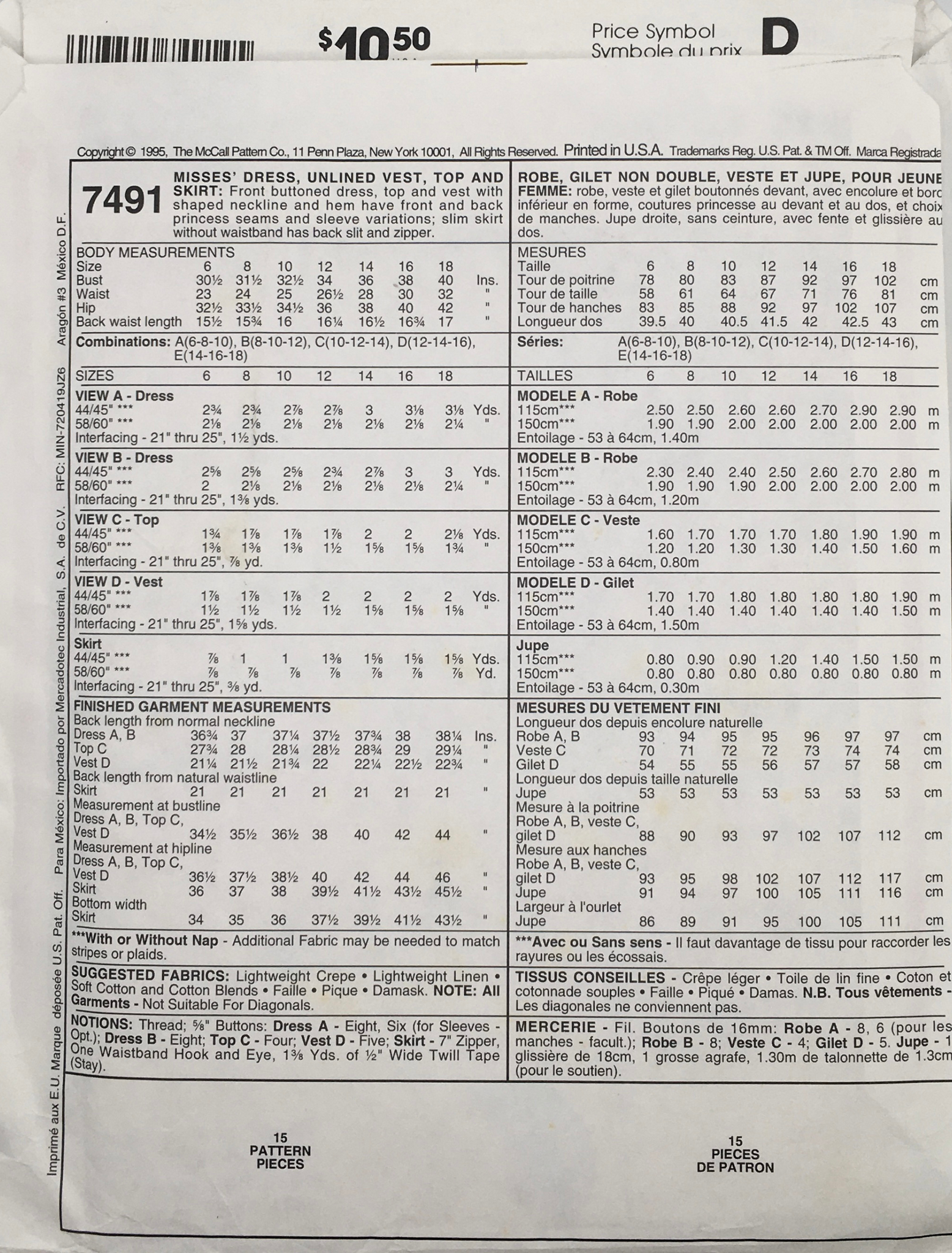 Misses’ Dress, Unlined Vest, Top and Skirt: Front buttoned dress top and vest with shaped neckline and hem ave front and back princess seams and sleeve variations; slim skirt without waist band has back slit and zipper.