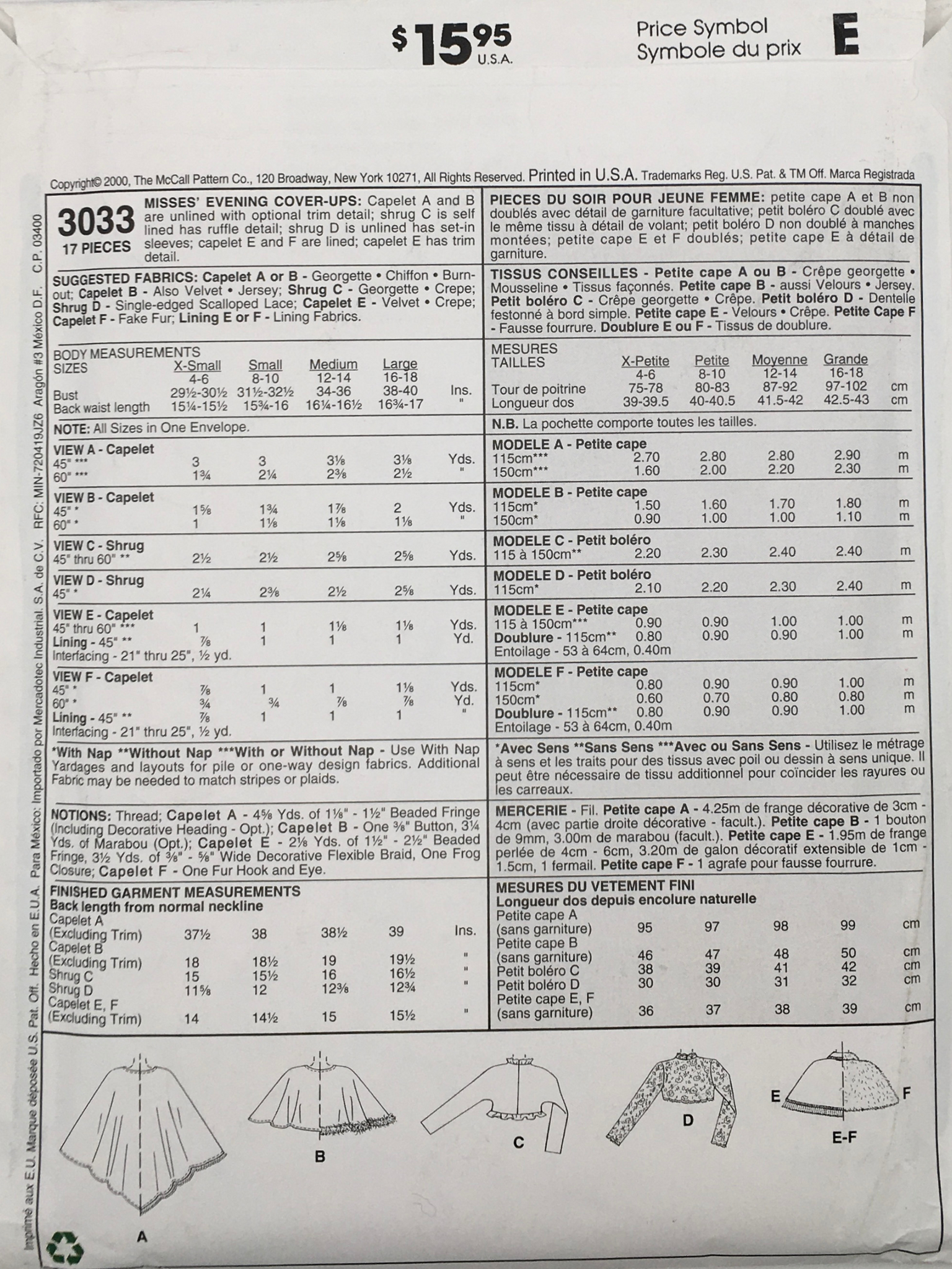 Misses' Evening Cover-Ups: Capelet A and B are unlined with optional trim detail shrug C is self lined has ruffle detail shrug D is unlined has set-in sleeves capelet E and F are lined capelet E has trim detail.