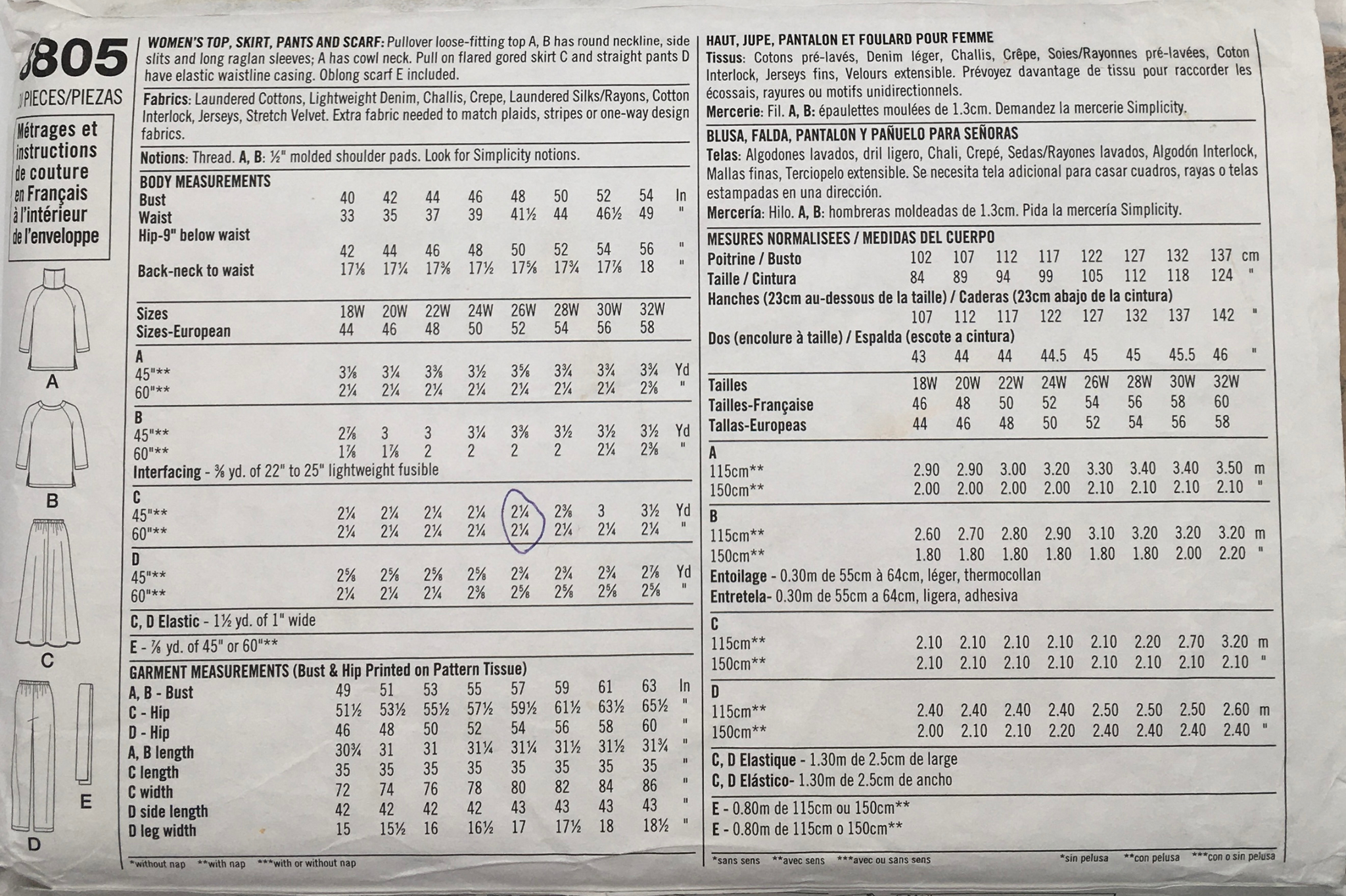 Women’s Top, Skirt, Pants and Scarf: Pullover Loose-fitting top. View A and B has round neckline, side slits and long raglan sleeves. View A has cowl neck. Pull-on flared gored skirt View C and straight pants View D have elastic waistline casing. Oblong scarf View E included.