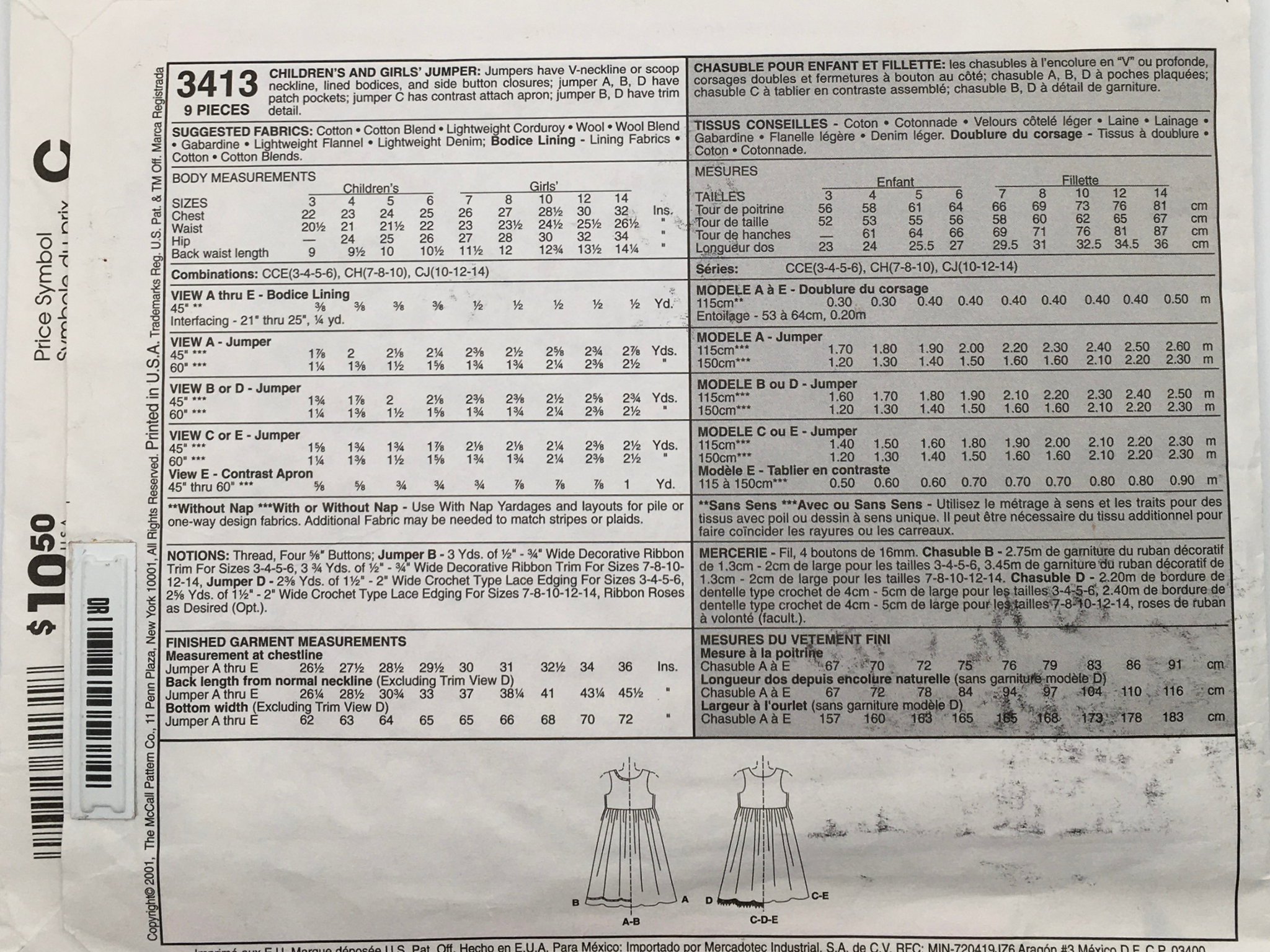 Children’s and Girls’ Jumper: Jumpers have V-neckline or scoop neckline, lined bodice, and side button closures; jumper A, B, D have patch pockets; jumper C has contrast attached apron; jumper B, D have trim detail.