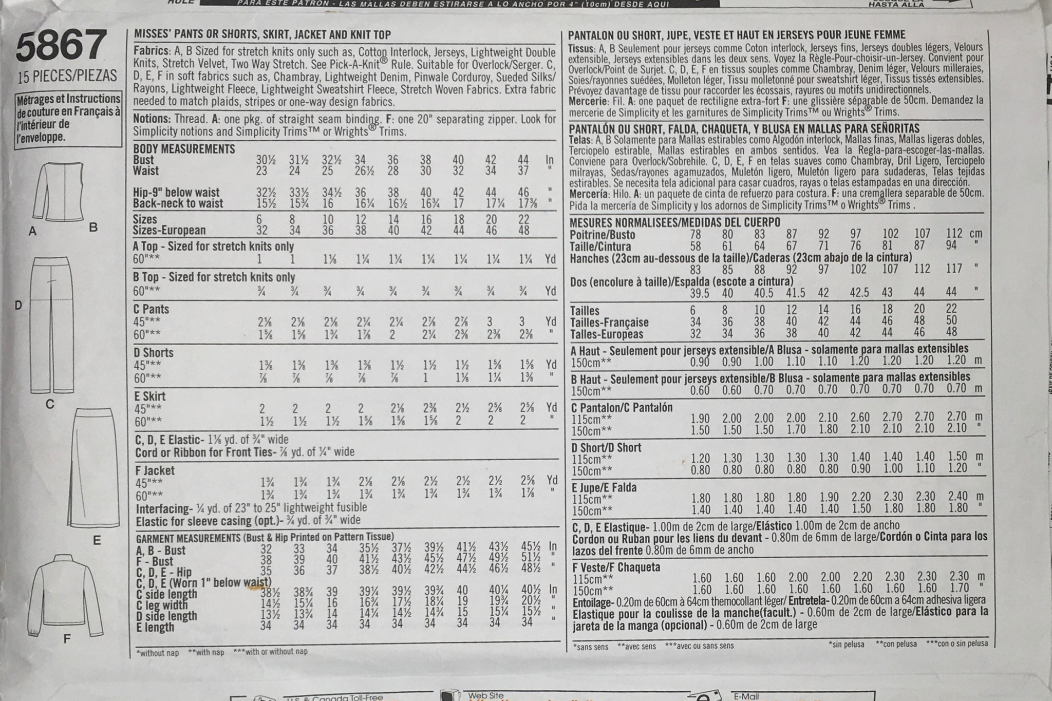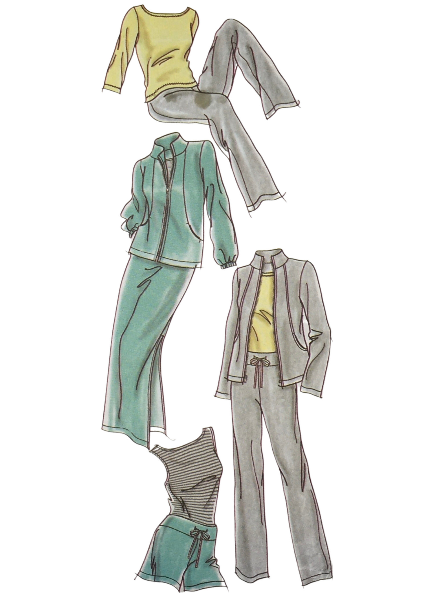 Misses' Pants or Shorts, Skirt, Jacket and Knit Top: This leisure ensemble pattern includes pull-on pants or shorts with a convenient pull cord at the waist, a stylish jacket featuring a front zip closure, elastic at the wrists, a collar, and handy pockets. The pattern also offers options for a comfortable top, with or without sleeves, and a trendy skirt. With this pattern, you can create a complete set of coordinated leisurewear that exudes both comfort and style. Customise the length and fit of the pants or shorts, experiment with different collar styles on the jacket, and choose your preferred sleeve length for the top. The possibilities are endless, allowing you to tailor your ensemble to your personal taste and create a fashionable and relaxed look for any casual occasion.