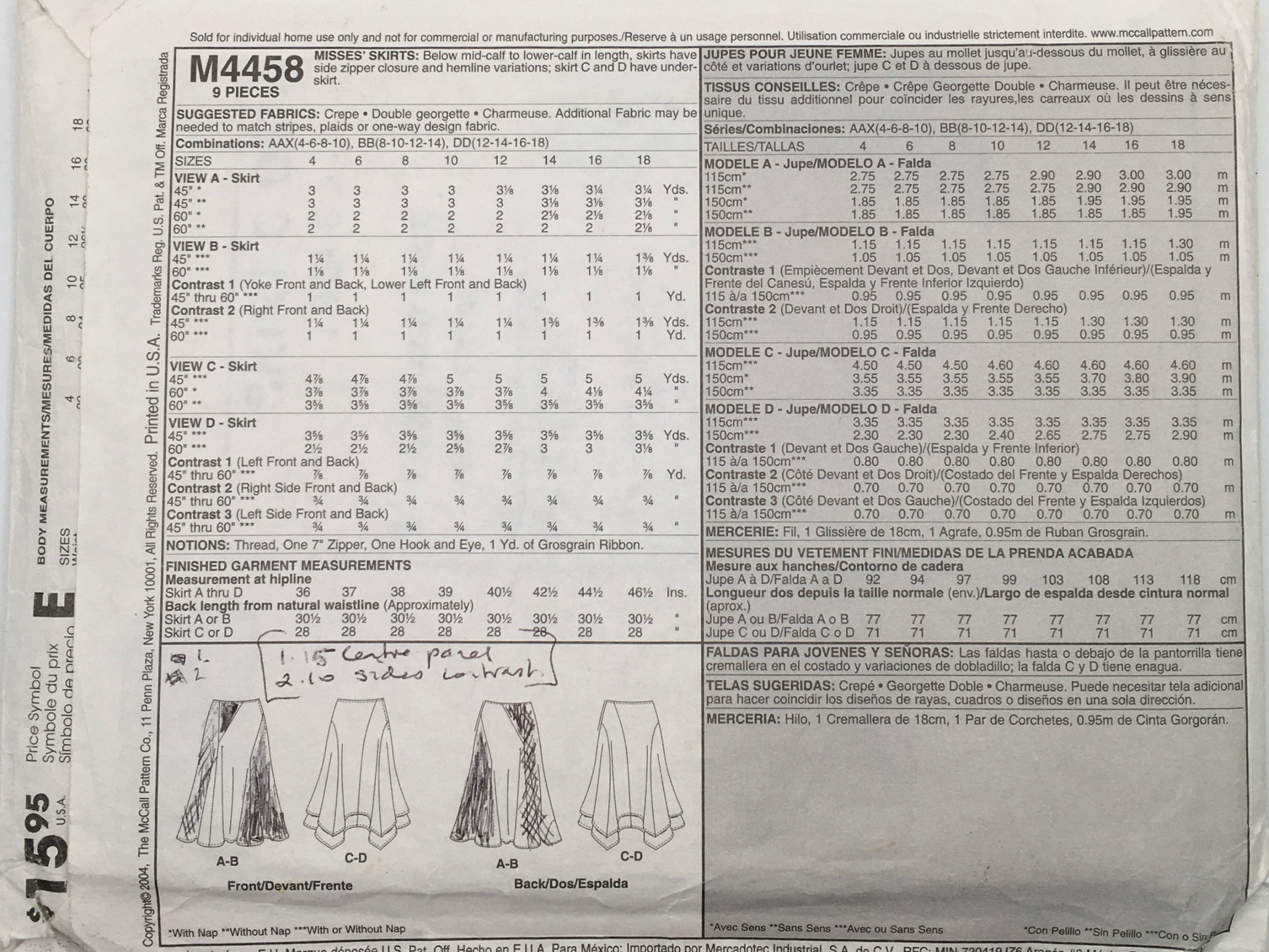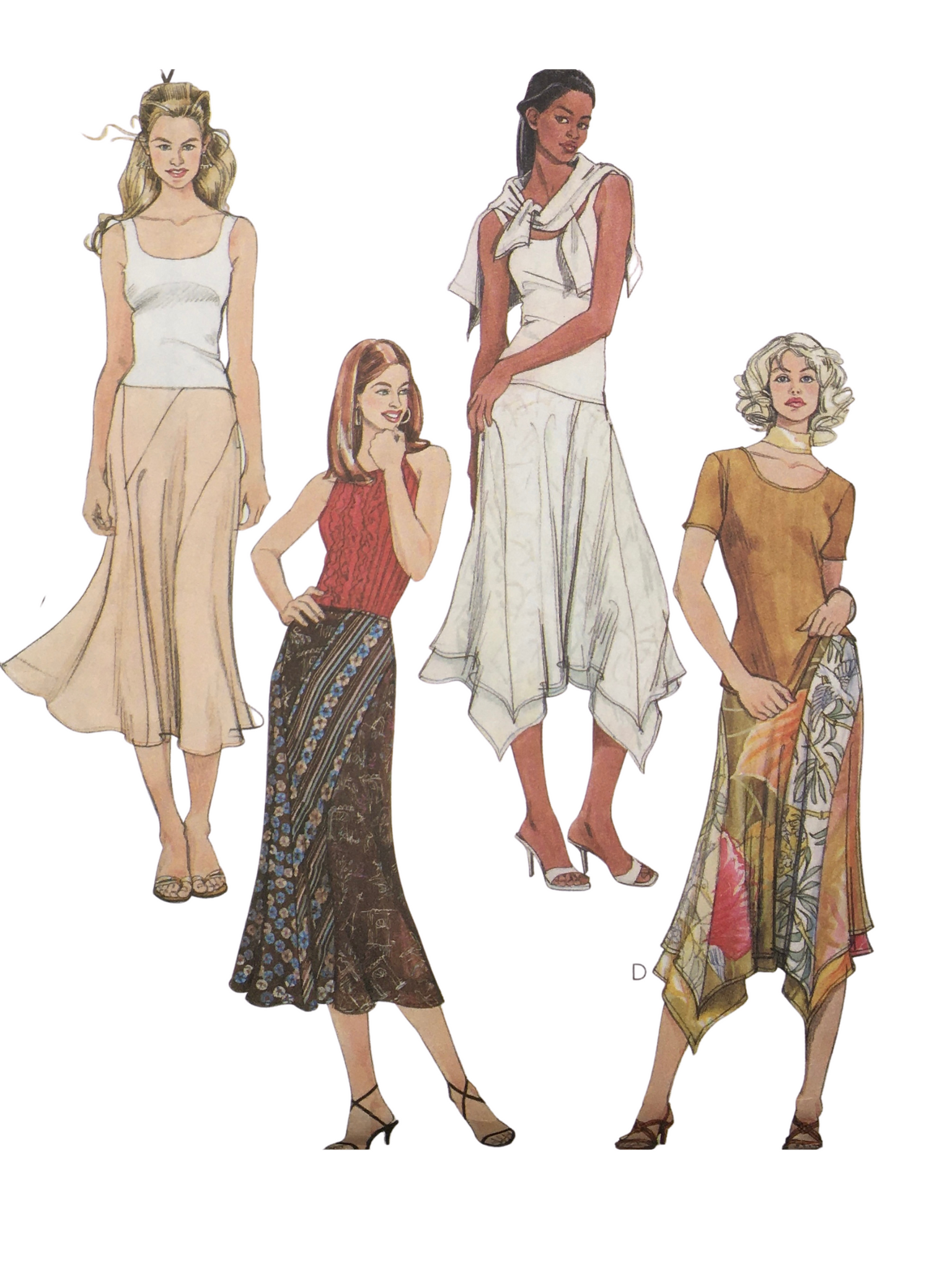 Misses' Skirts: Below mid-calf to lower-class in length, skirts have side zipper closure and hemline variations; skirt C and D have under-skirt.
