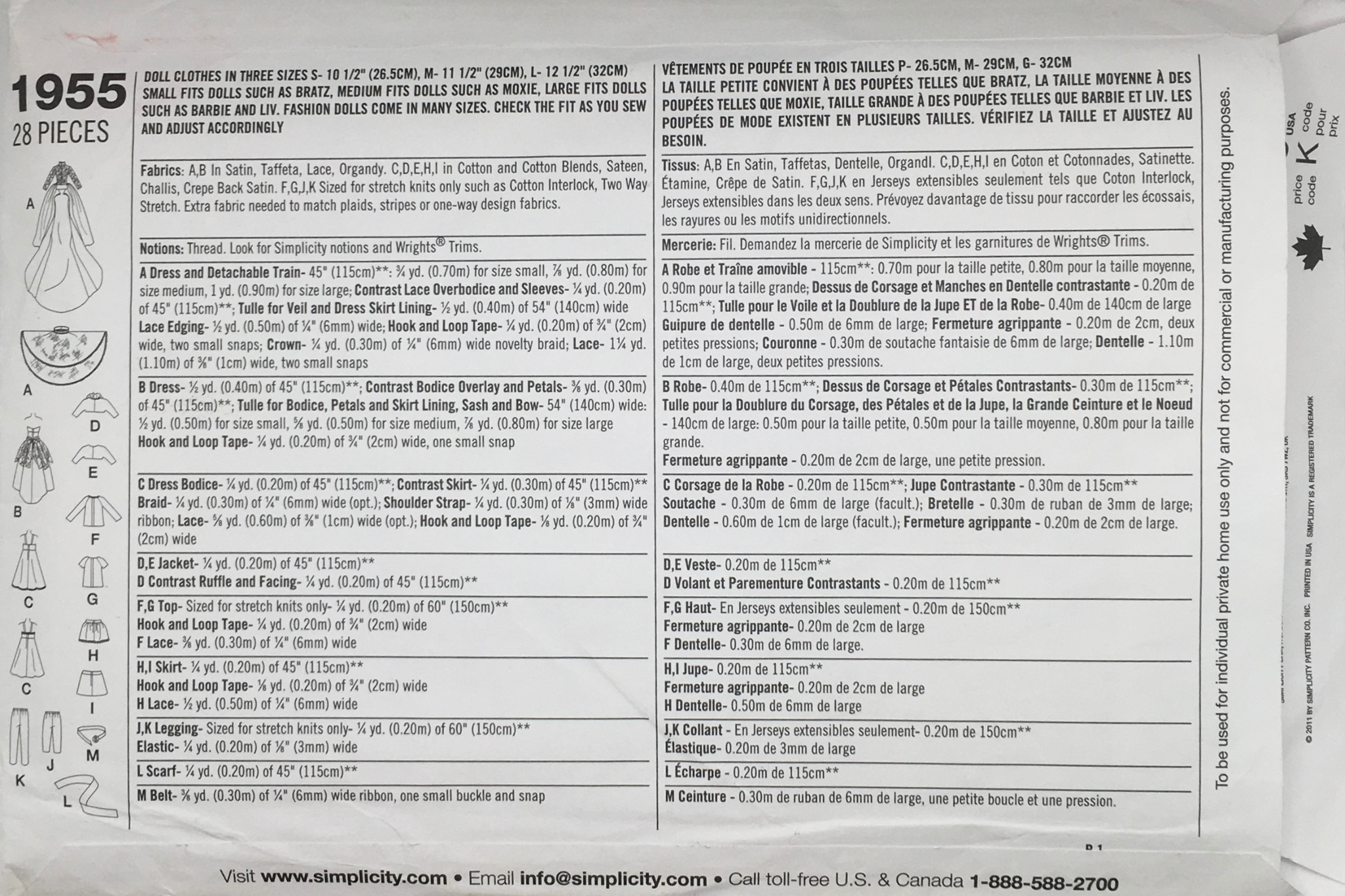 Suggested Fabrics: A, B in Satin, Taffeta, Lace, Organdy. C, D, E, H, I in Cotton, Cotton Blends, Sateen, Challis, Crepe back Satin. F, G, J, K Sized for Stretch Knits Only such as Cotton Interlock.
