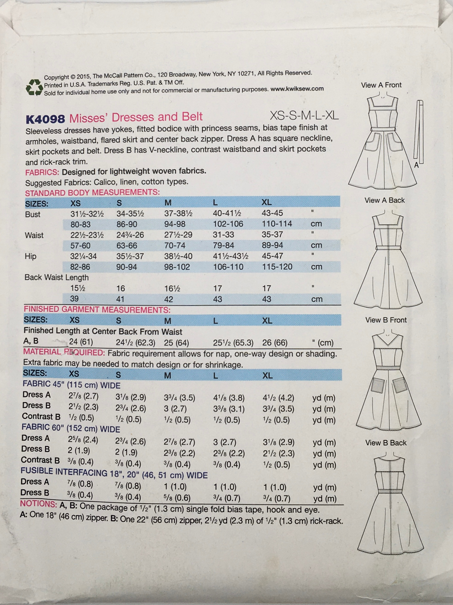 Misses’ Dresses and Belt: Dresses have yokes and a fitted bodice with bias tape finish armholes. Dress have a waistband, flared skirt and center back zipper. There are two neckline versions, one is square and the other is a V neckline.