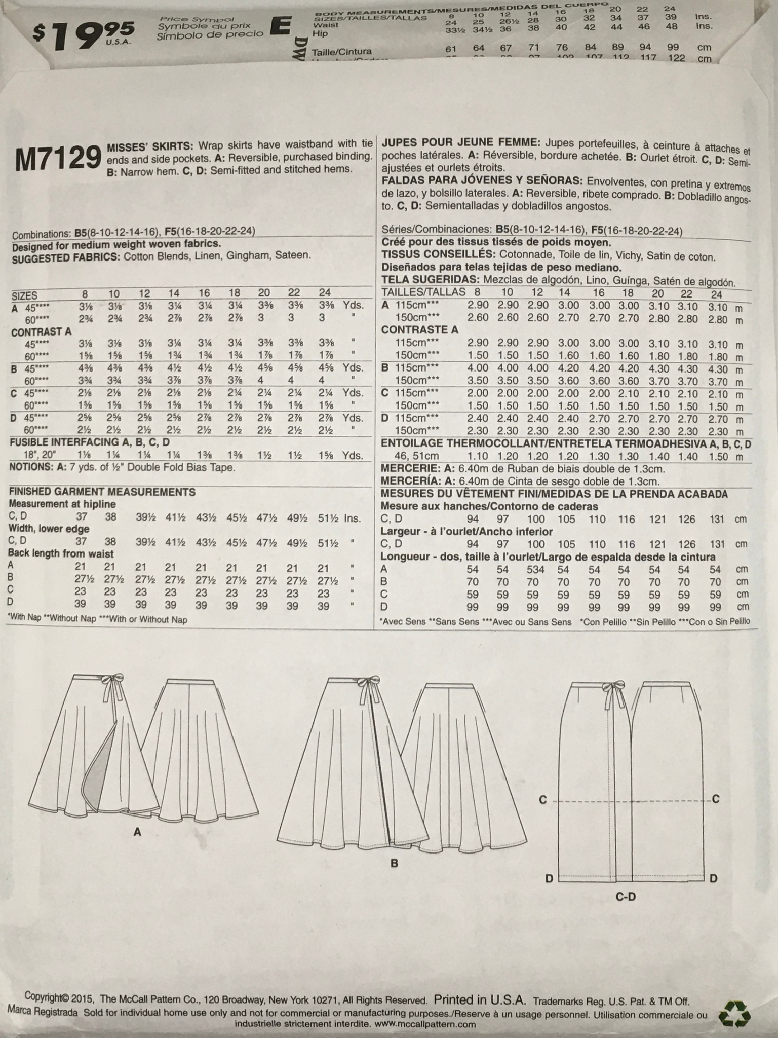 Misses' Skirt: Learn To Sew: Wrap skirts have waistband with tie ends and side pockets. A; Reversible, purchased binding. B; Narrow hem. C and D; Semi-fitted and stitched hems.