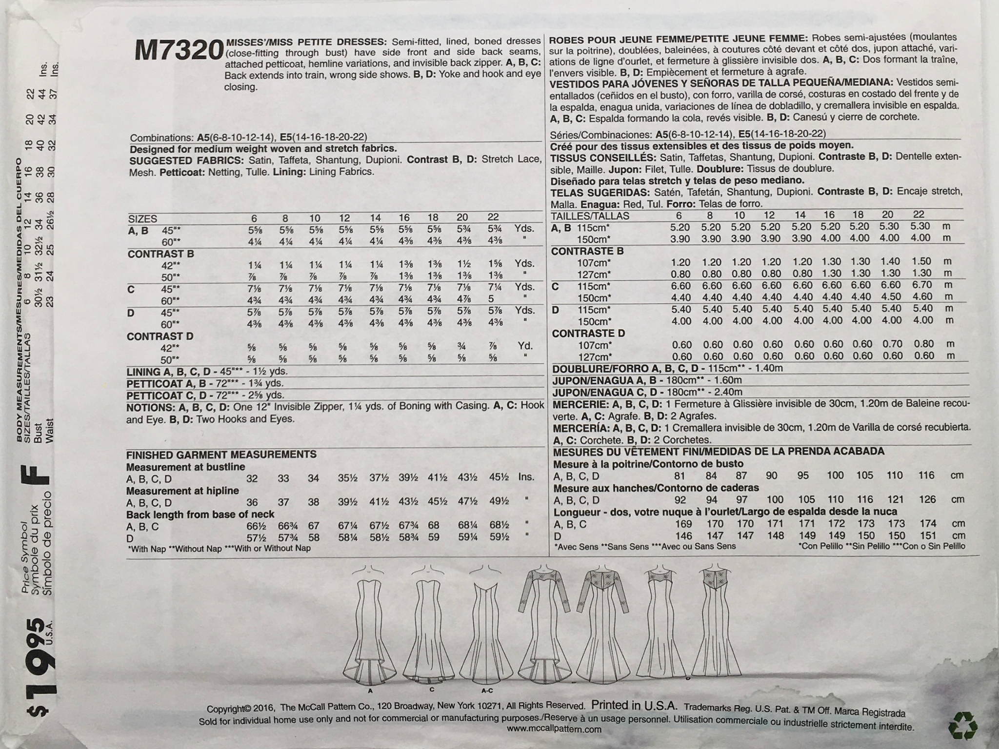 Misses'/ Miss Petite Dresses: Semi-fitted, lined, boned dresses (close-fitting through bust) have side-front and side-back seams, attached petticoat, hemline variations, and invisible back zipper. A, B, C: Back extends into train, wrong side shows. B, D: Yoke, and hook/eye closing.