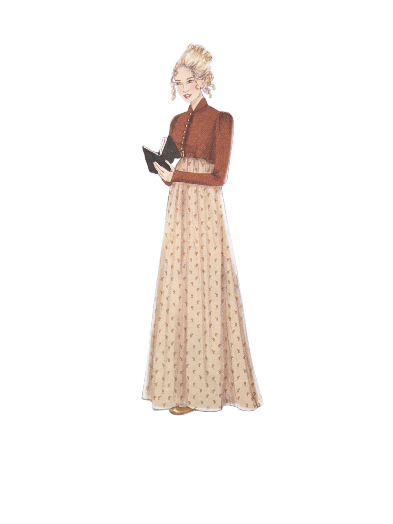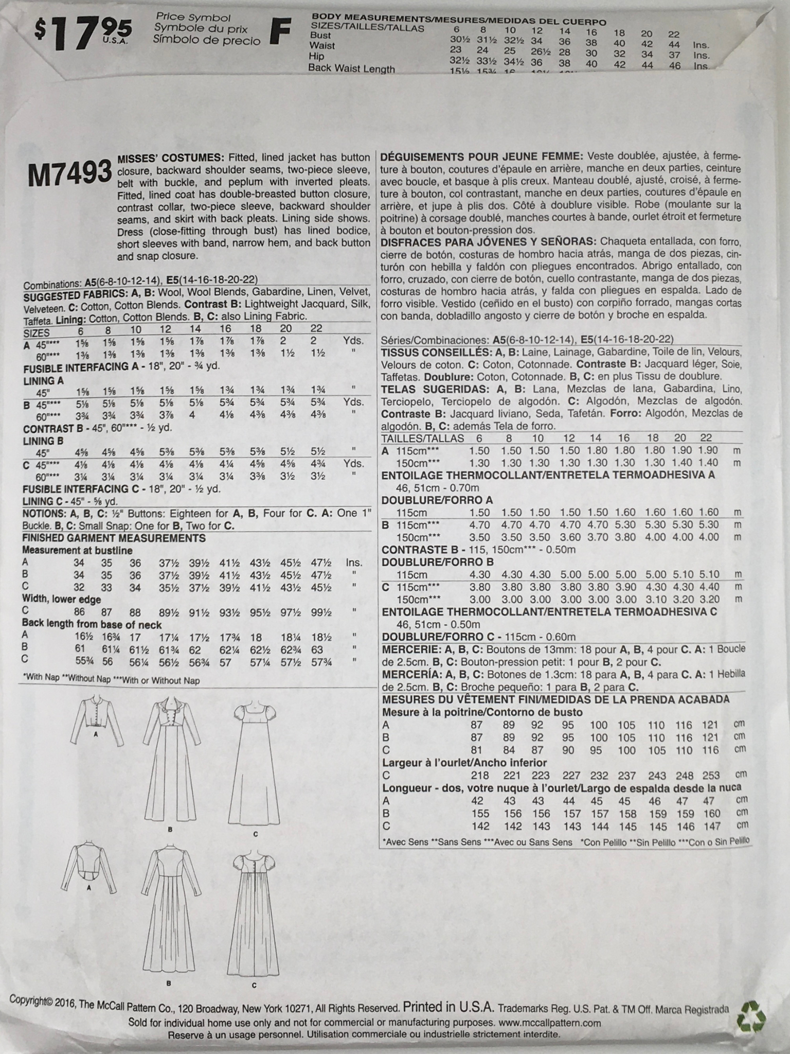 Misses' Costumes: With an easy sew rating, this Cropped Jacket, Floor-Length Coat and A-Line, Square-Neck Dress consist of fitted, lined jacket that has button closure, backward shoulder seams, two-piece sleeve, belt with buckle, and peplum with inverted pleats. Fitted, lined coat has double-breasted button closure, contrast collar, two-piece sleeve, backward shoulder seams, and skirt with back pleats. Lining side shows. Dress (close-fitting through bust) has lined bodice, short sleeves with band, narrow hem, and back button and snap closure.