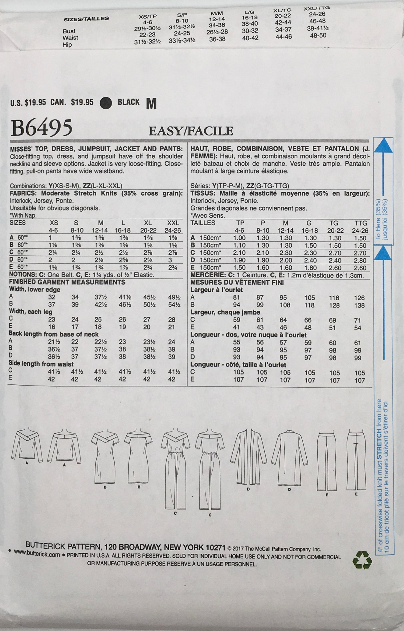 Misses’ Top, Dress, Jumpsuit, Jacket and Pants: Close-fitting top, dress and jumpsuit have off the shoulder neckline and sleeve options. Jacket is very loose fitting. Close-fitting pull-on pants have wide waistband.