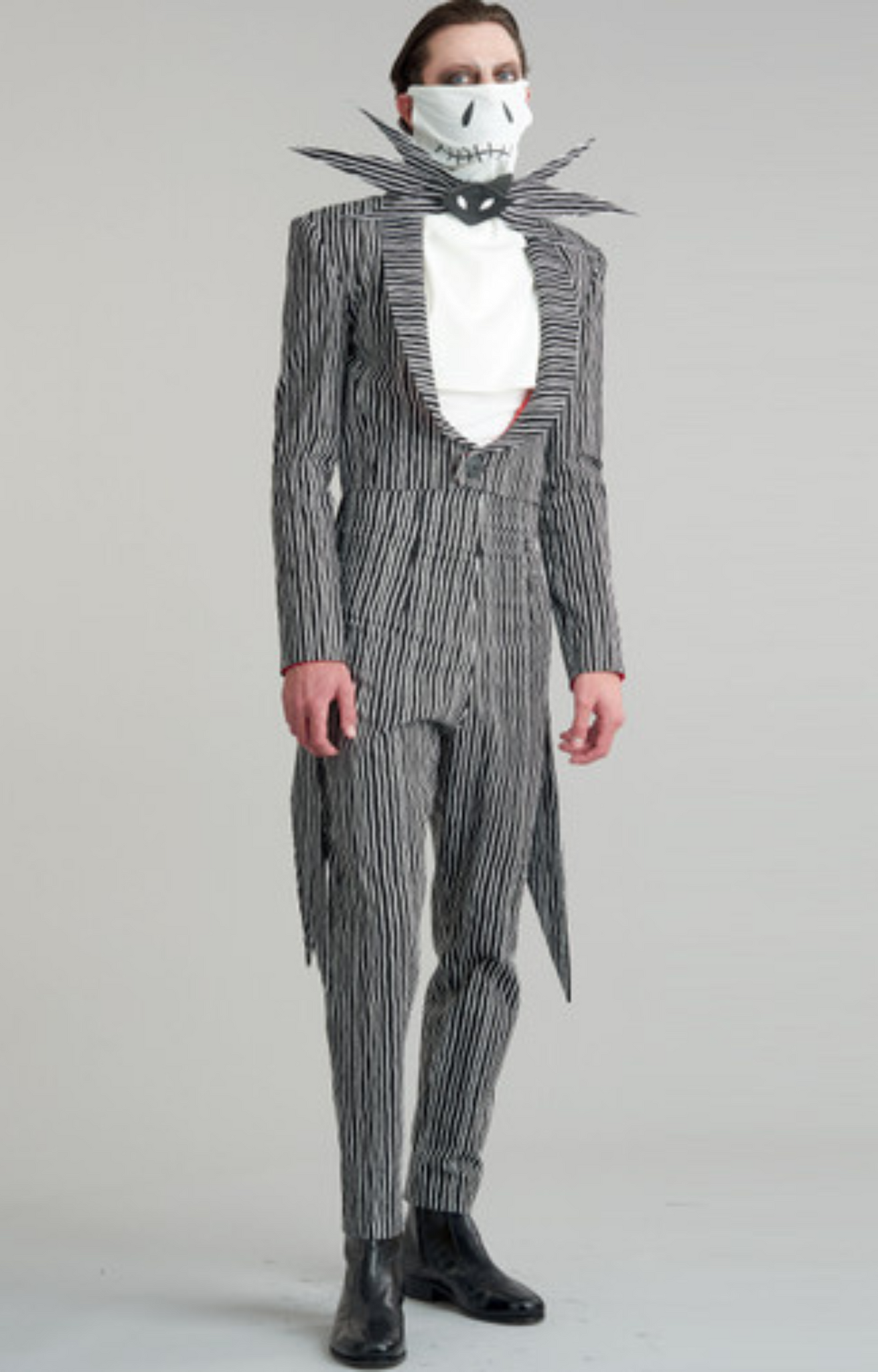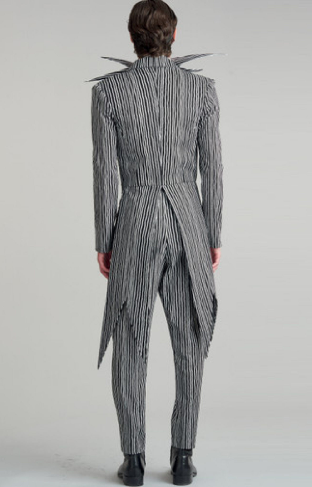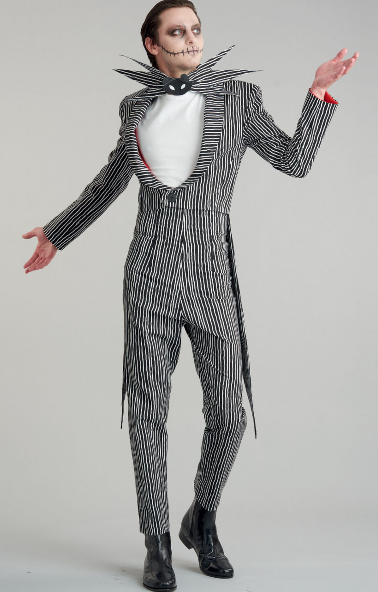 Mens' Costume and Knit Face Mask: Officially-licensed Disney© Jack Skellington: Costume includes fitted lined jacket with shawl collar and stylized tails. High-waisted slim pants have side zipper. Exaggerated bow tie has bat motif at center and secures with elastic neck band. Knit gaiter mask has openings for ears and skeletal facial details.