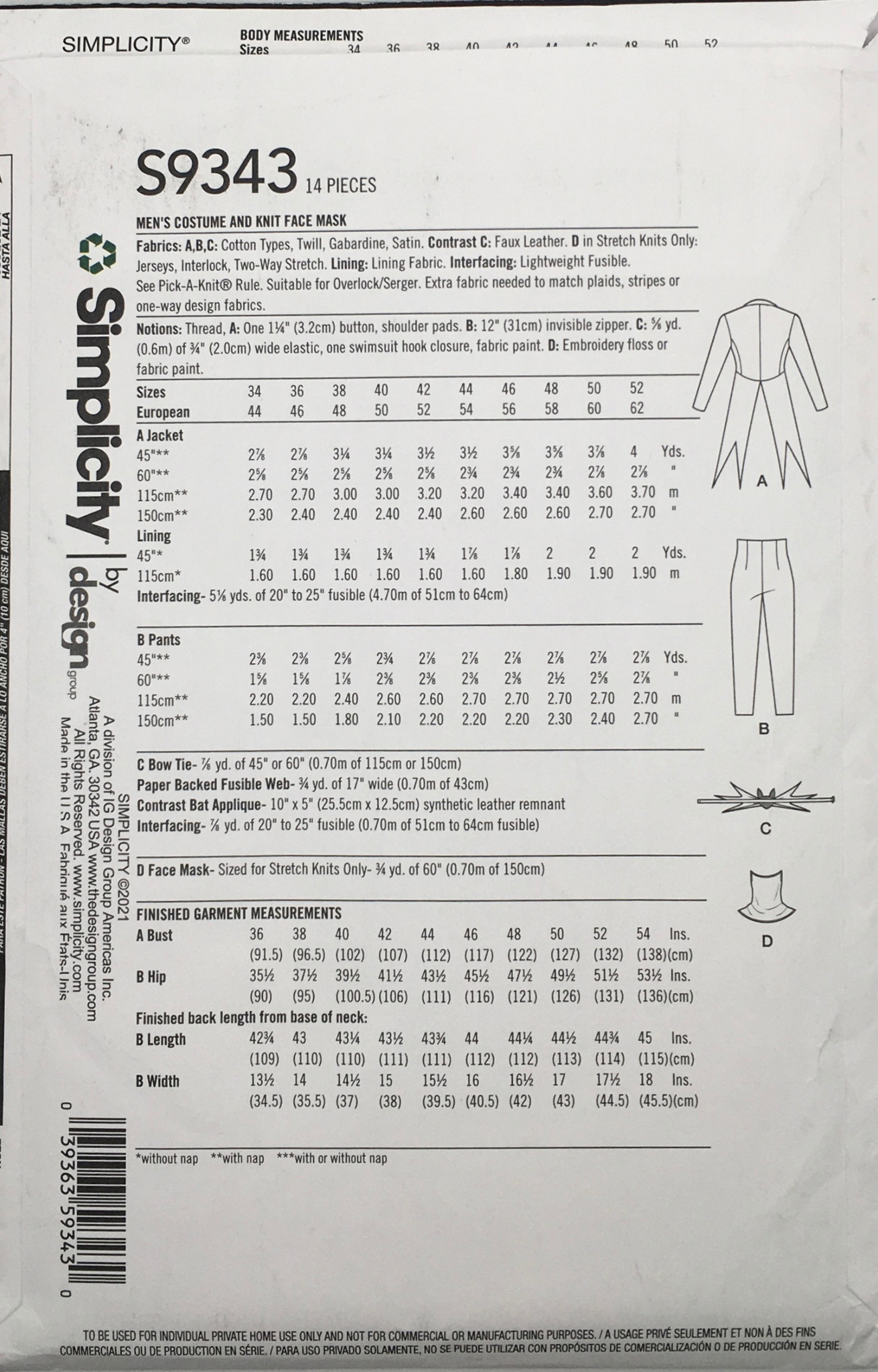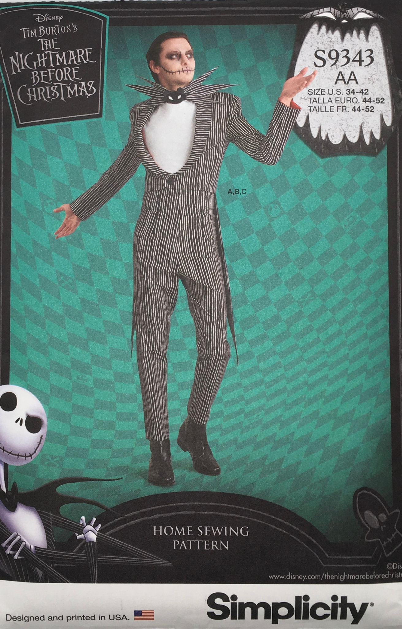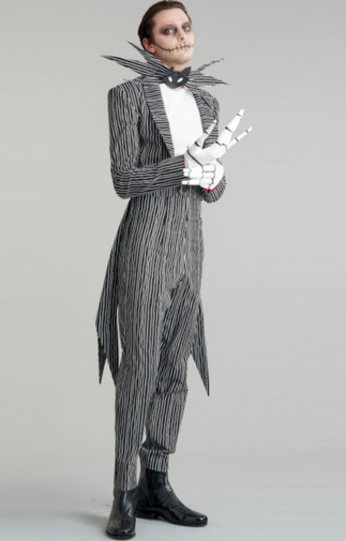 Mens' Costume and Knit Face Mask: Officially-licensed Disney© Jack Skellington: Costume includes fitted lined jacket with shawl collar and stylized tails. High-waisted slim pants have side zipper. Exaggerated bow tie has bat motif at center and secures with elastic neck band. Knit gaiter mask has openings for ears and skeletal facial details.