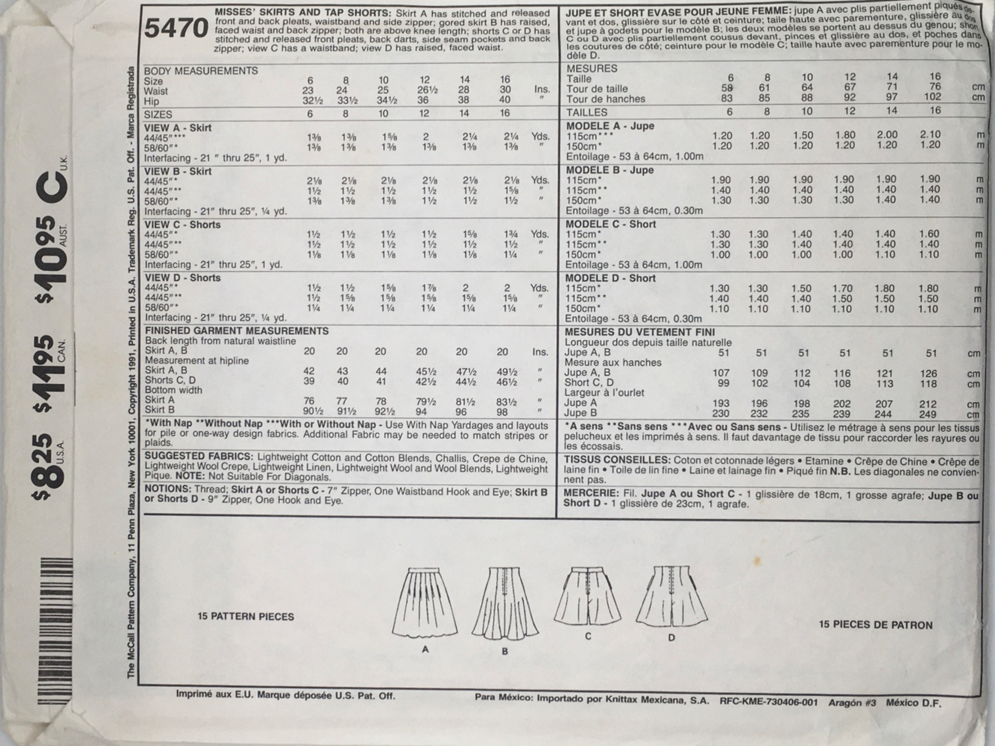 Misses' Skirts and Tap Shorts: This versatile pattern offers a range of stylish options. The skirt variations include stitched and released front and back pleats, a waistband, and a side zipper. You can choose between a gored skirt with a raised, faced waist and a back zipper or an above-knee length option. The shorts feature stitched and released front pleats, back darts, side seam pockets, a back zipper, and a waistband, with the choice of a raised, faced waist. This pattern provides the perfect foundation for creating chic and tailored bottoms. ©1991.