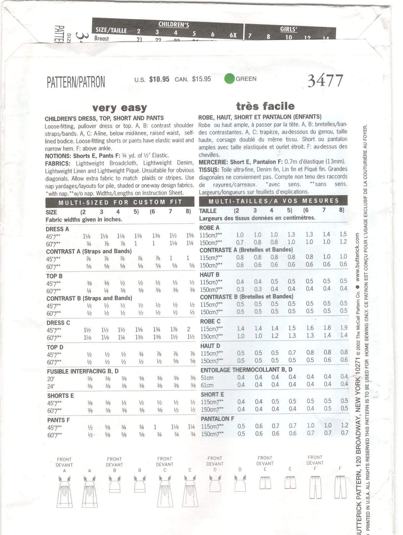 Child's Dress, Top, Shorts & Pants: Upgrade your child's wardrobe with Butterick 3477! This sewing pattern includes a dress, top, shorts, and pants, giving your little one multiple options to mix and match their outfits. Say goodbye to boring clothes and hello to versatile and stylish pieces!©2002.