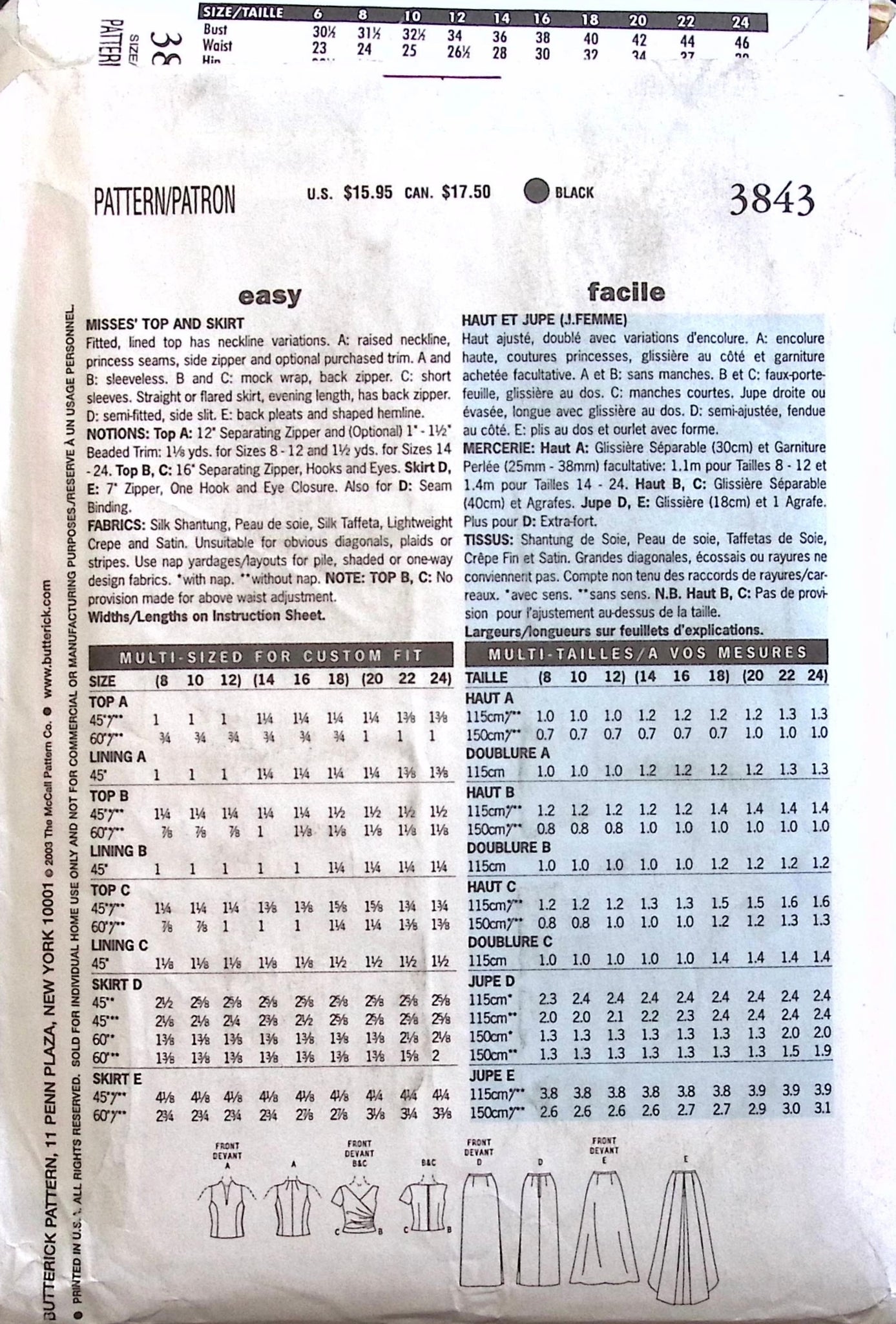 Misses’ Top & Skirt: The fitted, lined top comes with various neckline variations, including a raised neckline and princess seams, with options for a side zipper and optional purchased trim. It can be styled sleeveless, with a mock wrap and back zipper, or with short sleeves for added versatility. The straight or flared skirt, available in evening length, features a back zipper closure. Additionally, it offers options for a semi-fitted silhouette with side slits or back pleats and a shaped hemline, providing endless possibilities for creating elegant ensembles. ©2003.