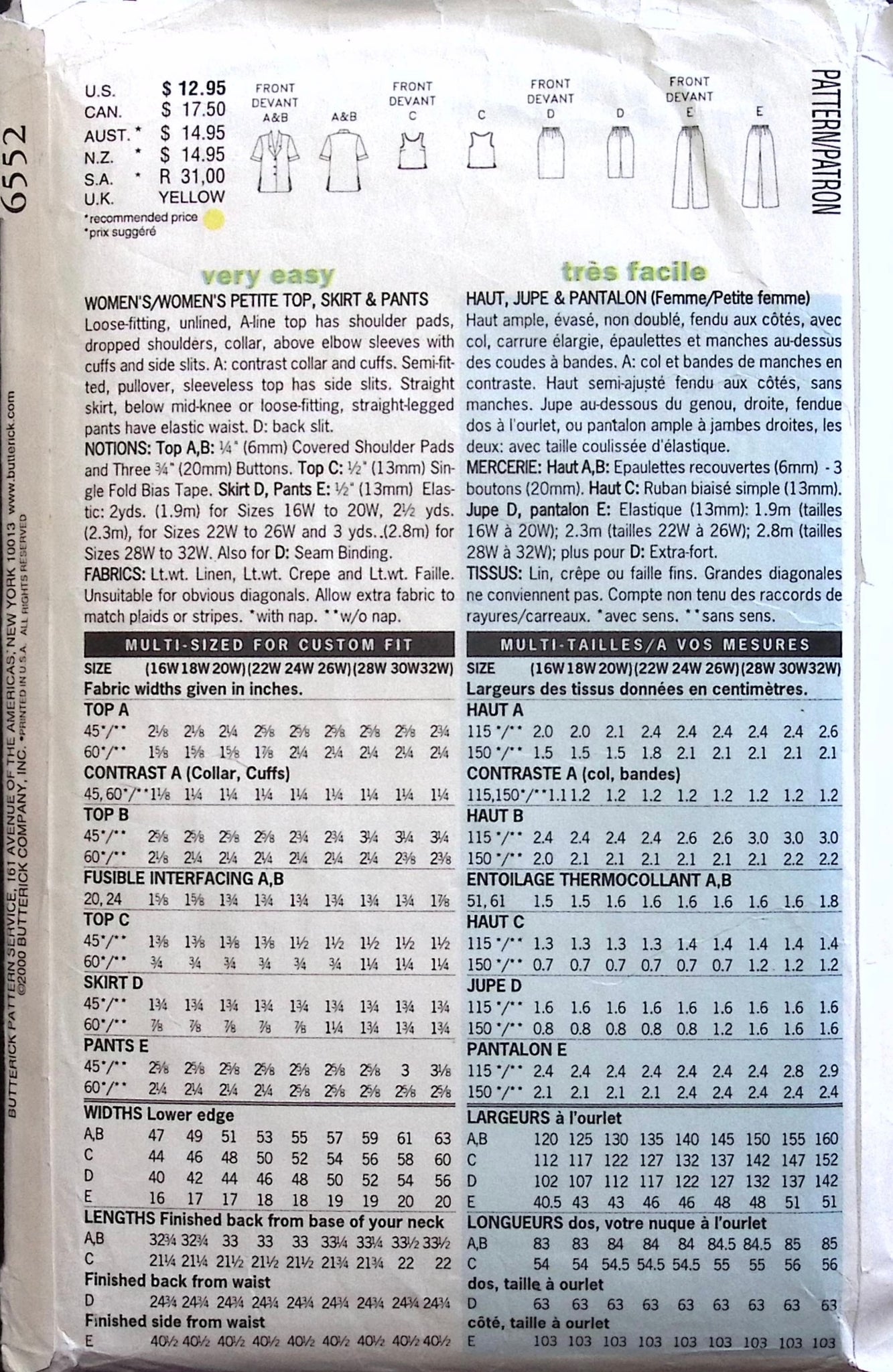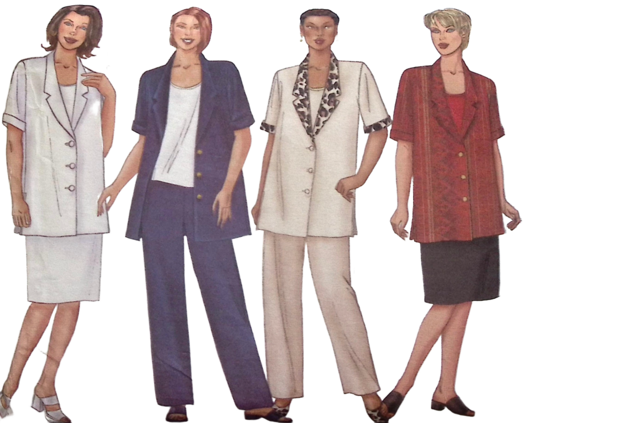 Misses’ Top, Skirt & Pants: A versatile ensemble with a notched collar top adorned with front buttons, providing both style and functionality. Alongside, you'll find a slim skirt and pants, carefully crafted with elastic waistbands, ensuring comfort throughout the day while maintaining a flattering silhouette. ©2000.