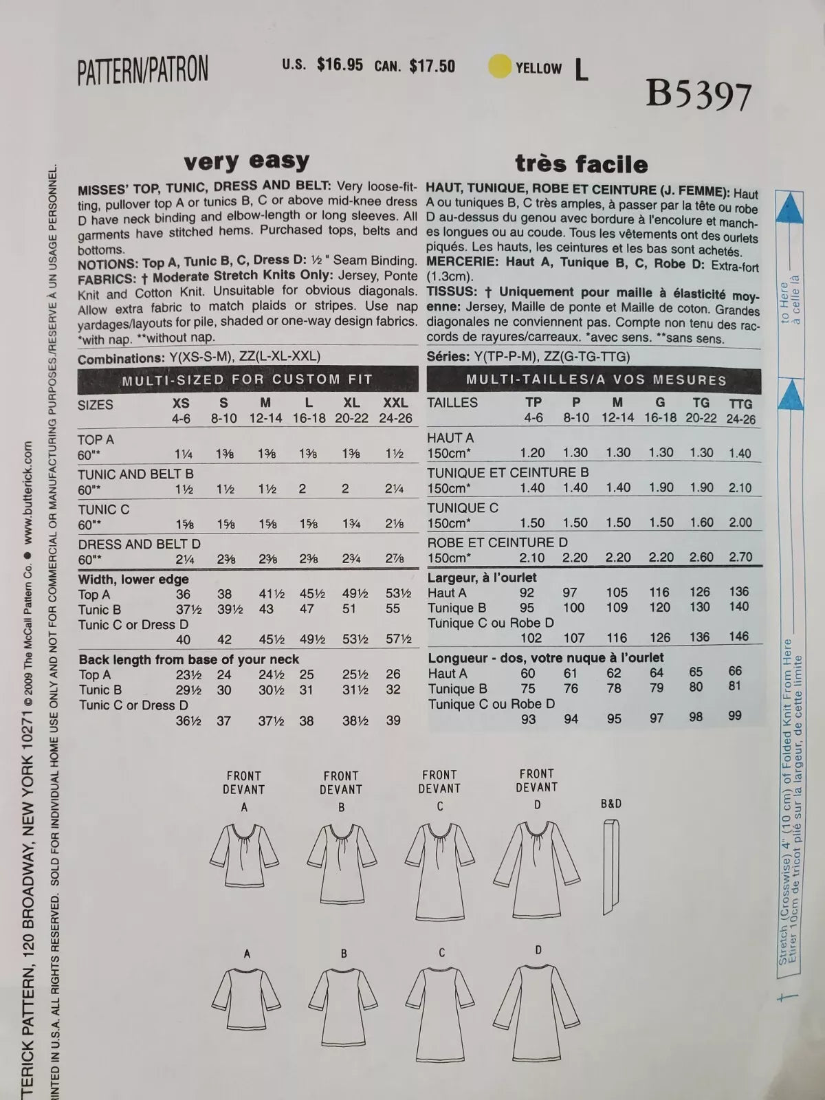 Misses' Top, Tunic, Dress & Belt: This versatile design offers easy creation of loose-fitting tops, tunics, or dresses with customisable sleeves, plus a chic belt. Perfect for effortless style and endless possibilities. Get ready to sew and slay! ©2009.