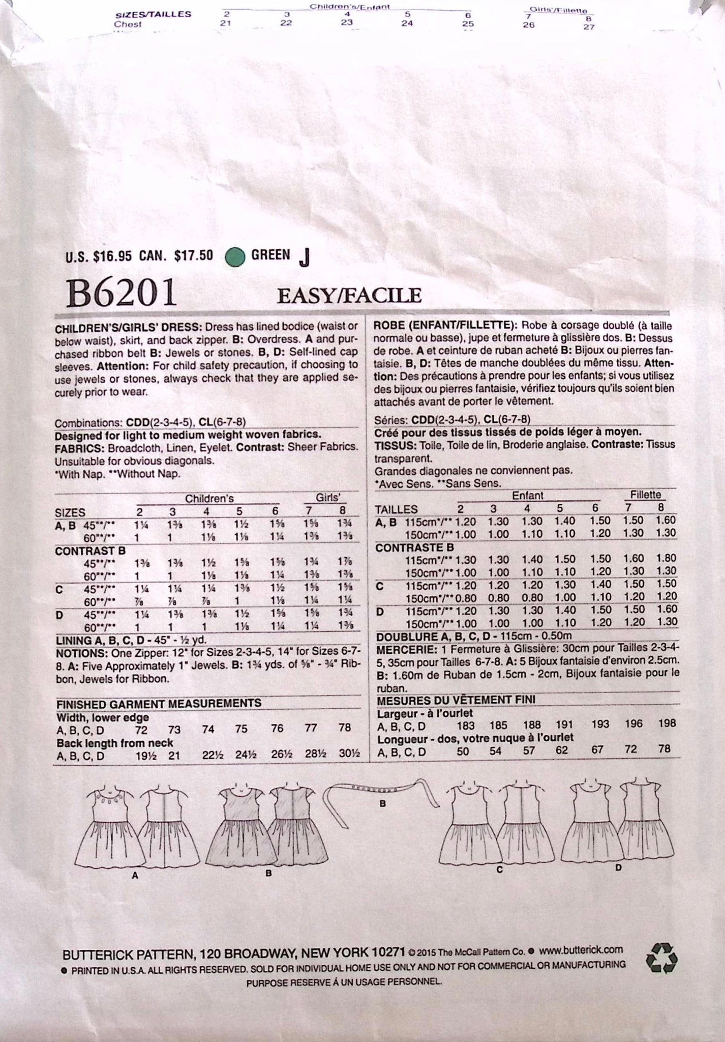 Child's Dress: Add some charm to your child's wardrobe with Butterick B6201 sewing pattern. This playful dress features a lined bodice with a skirt and back zipper, perfect for any occasion. With options for an overdress and self-lined cap sleeves, this dress is easily customisable. Just be sure to securely apply any added jewels or stones for your child's safety. ©2015.