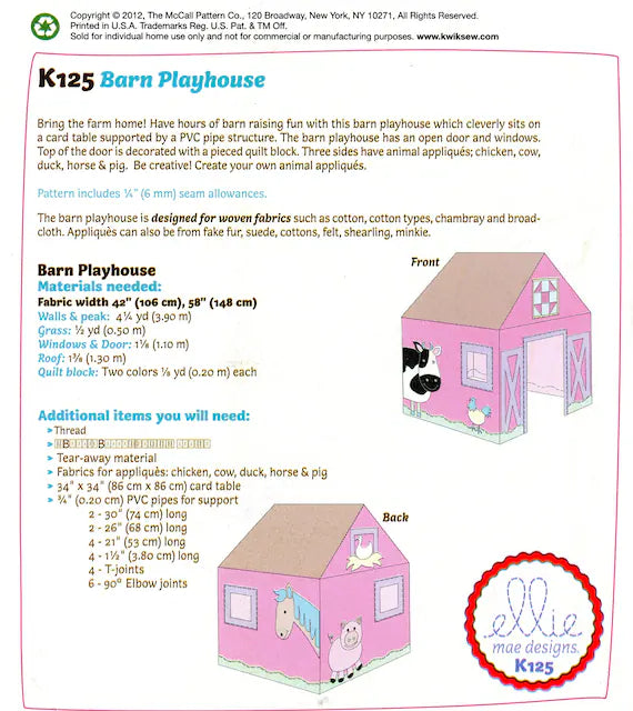 Old McDonald's Playhouse: Bring farmyard charm to your sewing projects with this delightful barn playhouse pattern. This Kwik Sew design features an open door and windows for interactive play, while a pieced quilt block adorns the doorway. Three sides showcase charming animal appliqués—chicken, cow, duck, horse, and pig—perfect for teaching little ones about farm life. Ideal for creating a whimsical fabric playhouse that sparks imagination and becomes a cherished handmade keepsake. ©2012.