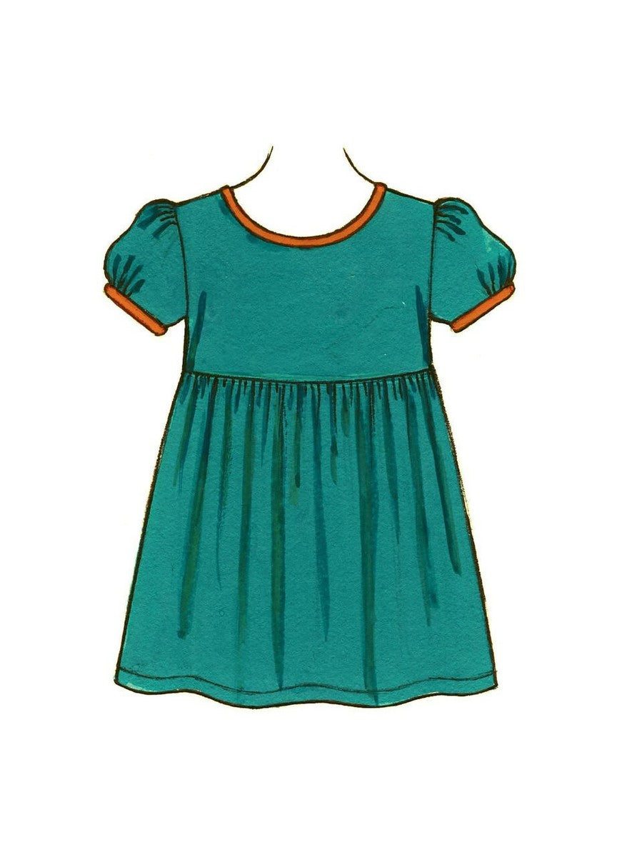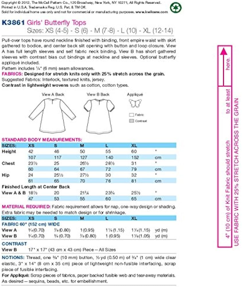 Girl's Tops: Master the art of effortless elegance with this versatile sewing pattern featuring two stunning pull-over top designs. Both views showcase a flattering empire waist with a gracefully gathered skirt, rounded neckline with binding detail, and a practical center back slit with button closure. Choose between View A's classic full-length sleeves or View B's charming short gathered sleeves with contrasting bias bindings. The included optional butterfly appliqué lets you personalise your creation. Perfect for crafting timeless pieces that flatter every figure and suit any occasion. ©2012.