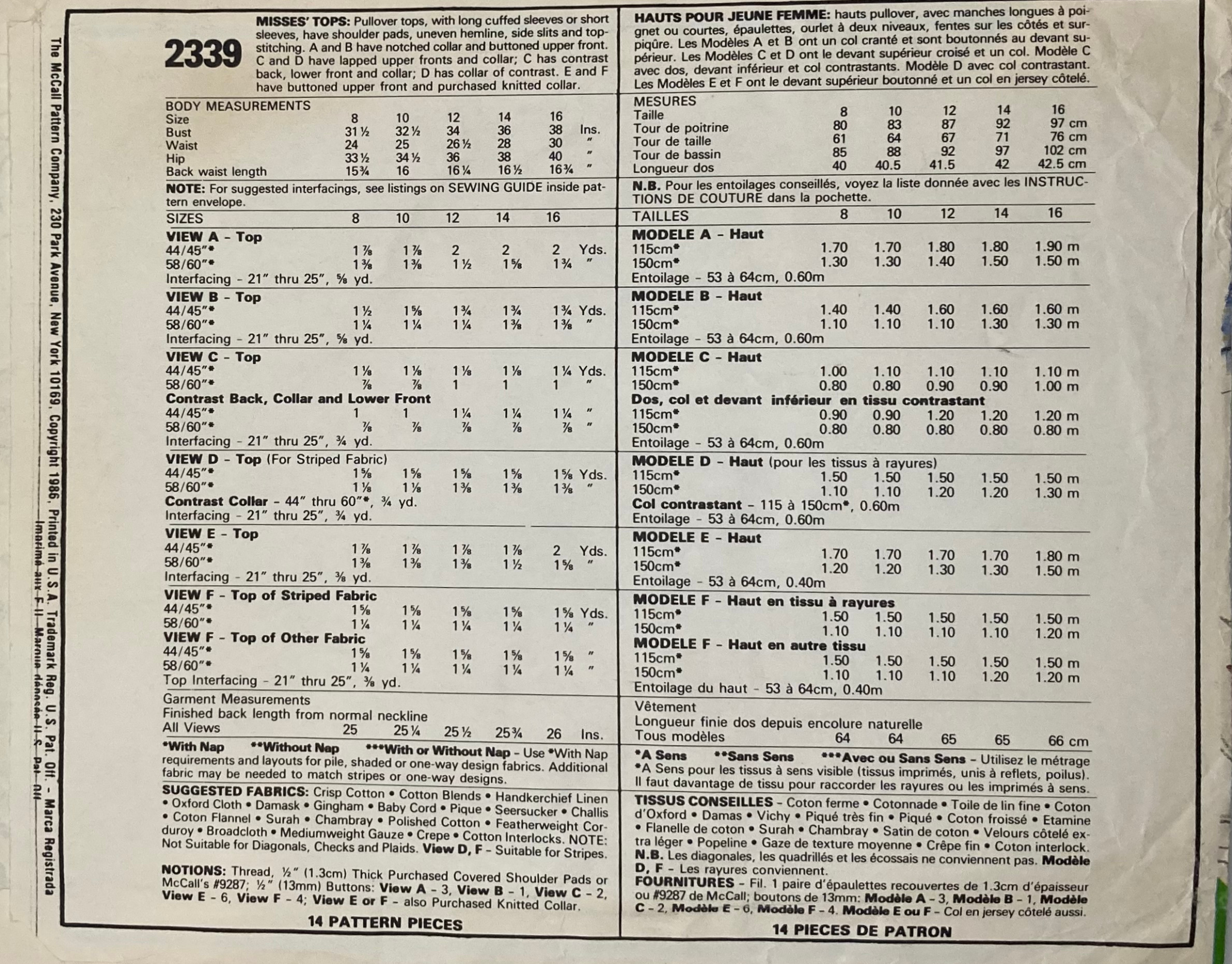 Misses’ Tops: Pullover tops available in two sleeve lengths – long cuffed sleeves or short sleeves. These tops come with the addition of shoulder pads, lending structure to the silhouette. The design boasts an asymmetrical hemline with side slits, offering a distinctive touch. A detail of top-stitching enhances the overall appearance. Moreover, the pattern offers a variety of collar options, allowing for creative customisation. ©1986.
