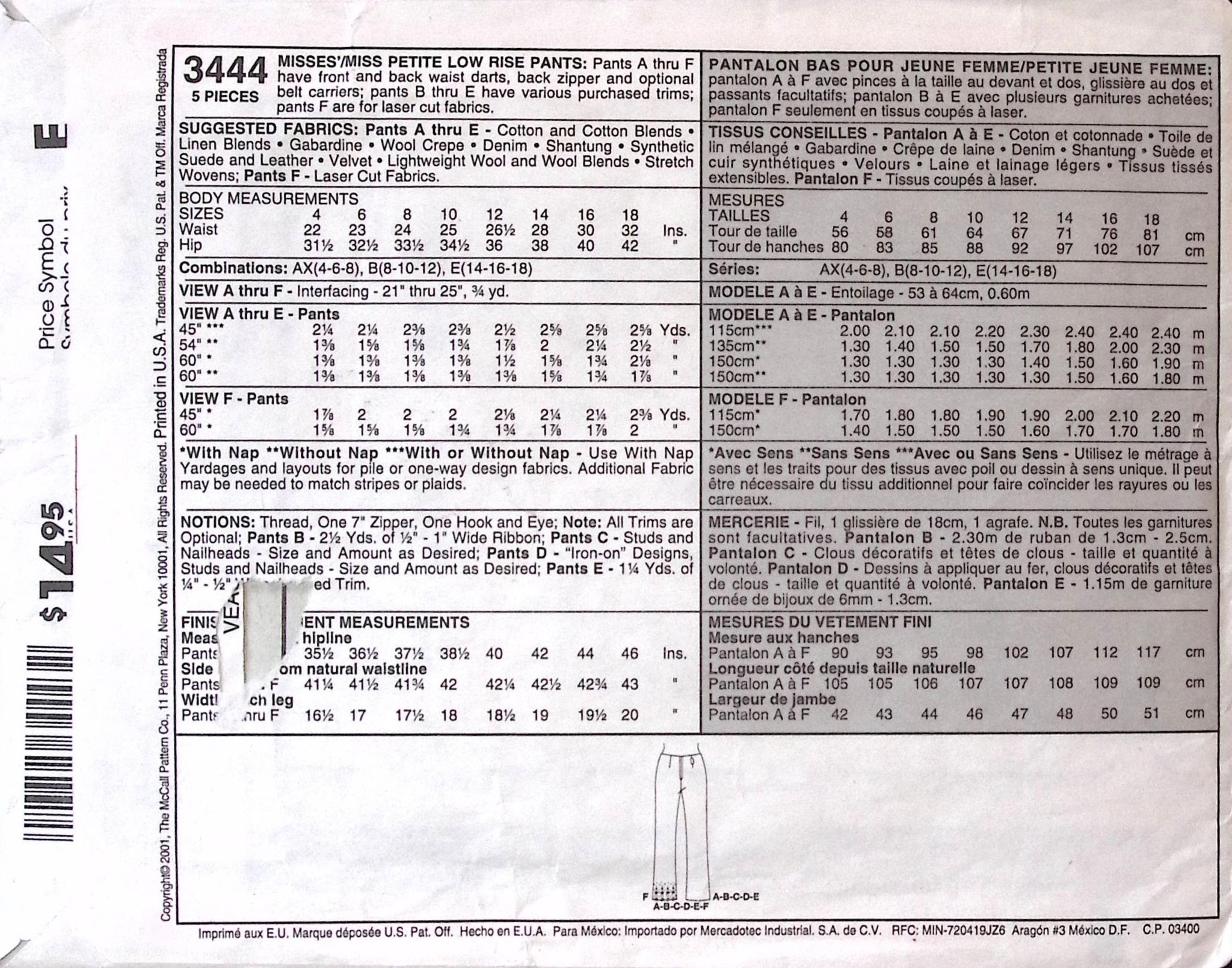 Misses' Pants: Get ready to sew up some style with McCalls 3444! These Misses' Low Rise Pants feature front and back waist darts for a flattering fit. The back zipper and optional belt holders add versatility to your wardrobe. Time to stitch up some fun! ©2001.